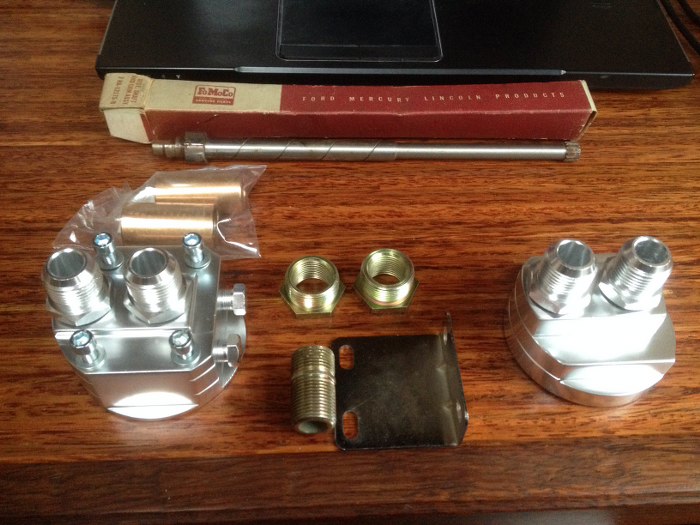 A teraz zmiana tematu. Pamiętasz, jak pisałem, że silnik miał filtrowaną tylko część oleju, jeśli w ogóle miał filtr. Zwróciłem na to uwagę Michałowi, że warto by to zmienić przy okazji remontu. Dlatego pod choinką znalazł części zestawu, który służy do przeniesienia filtra oleju dalej od silnika - zestaw od czego innego, ale potrzebujemy z tego tak naprawdę podstawkę pod filtr.