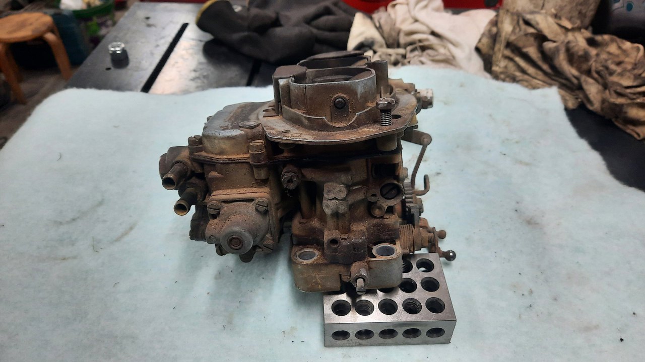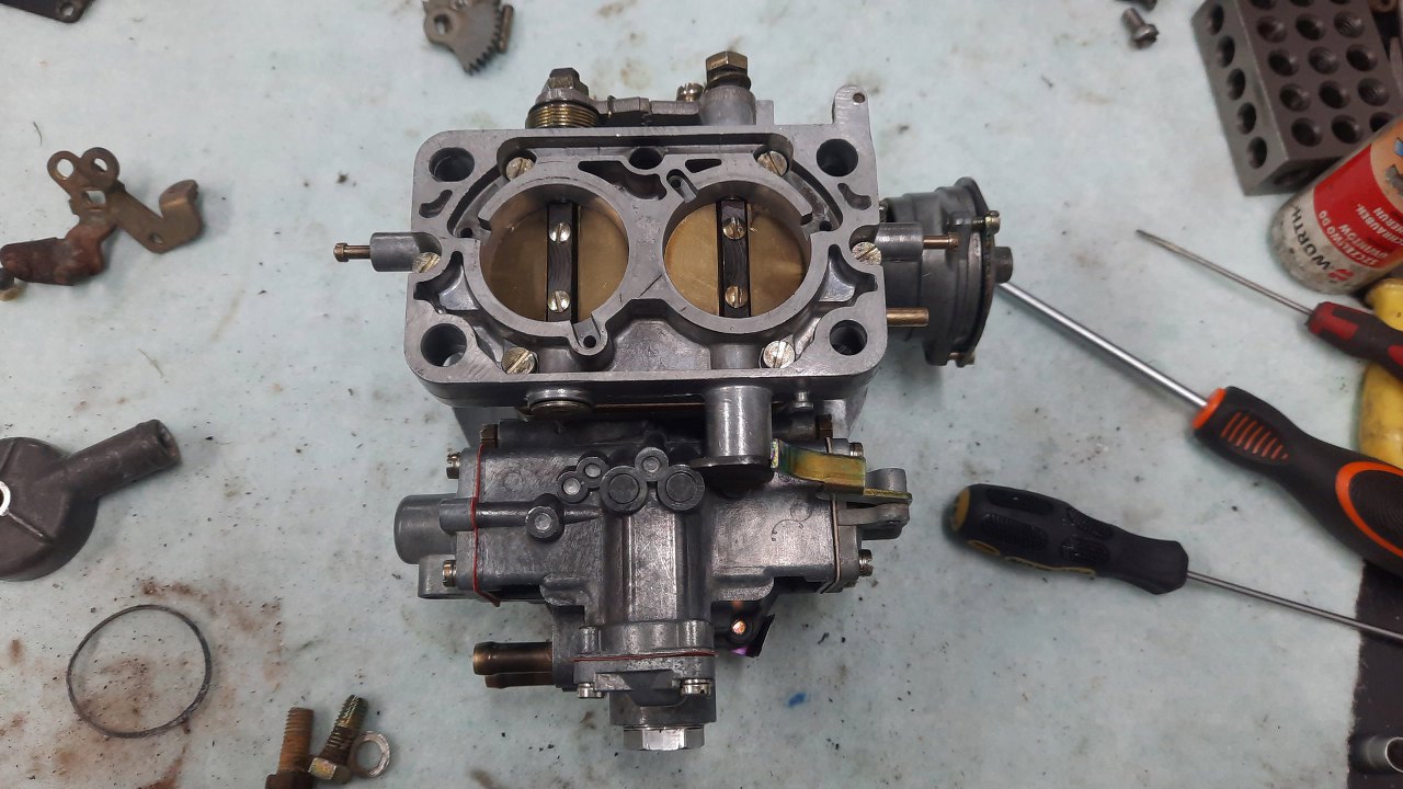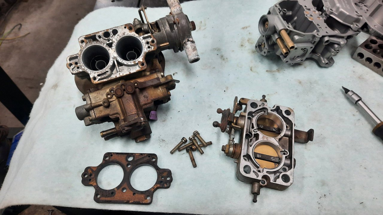 Ponieważ te gaźniki mogły się również w środku różnić, najpewniejszym sposobem na zbudowanie dokładnej kopii gaźnika jest wzięcie z niego wszystkich części i użycie identycznych, albo - jak ja tu zrobię - użycie tych części w nowej obudowie. Najpierw rozkręcam płytkę przepustnic.