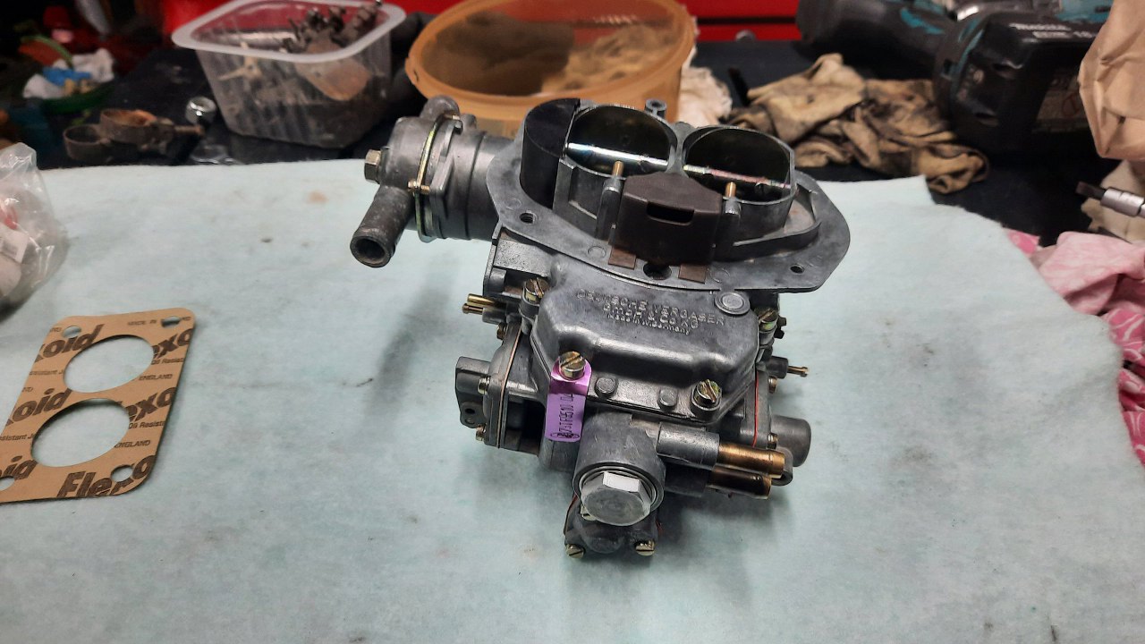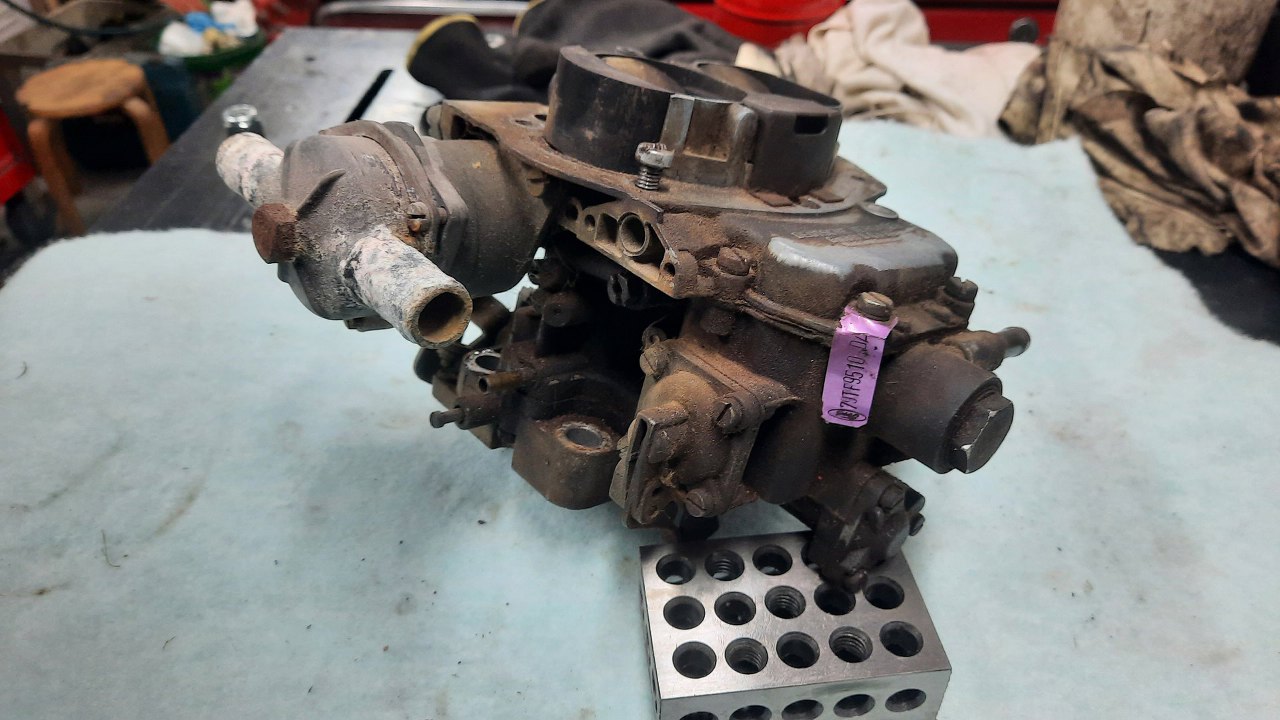 Kolejny gaźnik Pierburg Solex EEIT, 35/35. Dość typowy gaźnik dla Fordów z silnikiem V6 w latach '70 i '80, stąd go tak dużo u mnie. Wersja 35/35, czyli z przepustnicami o tej średnicy, występował w silnikach o pojemności 2.3l. Ten trafił do mnie z Forda Taunusa 17m, ale silnik jest tam włożony z ciut nowszego Forda.