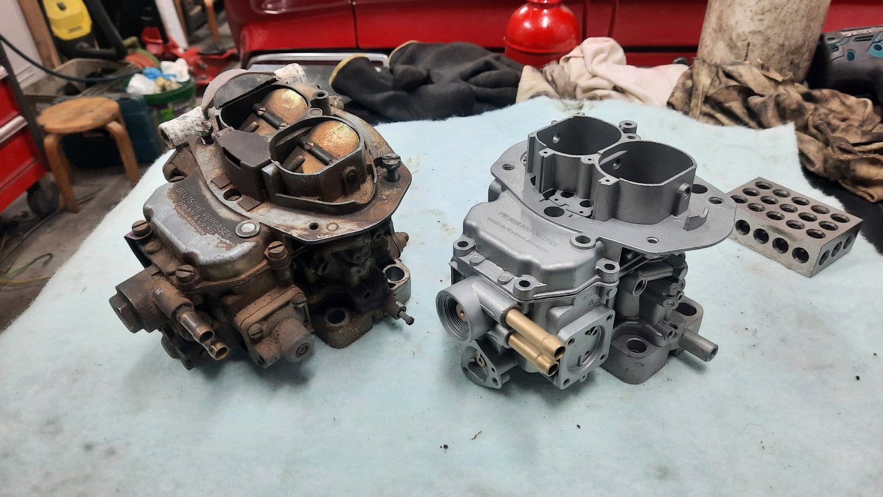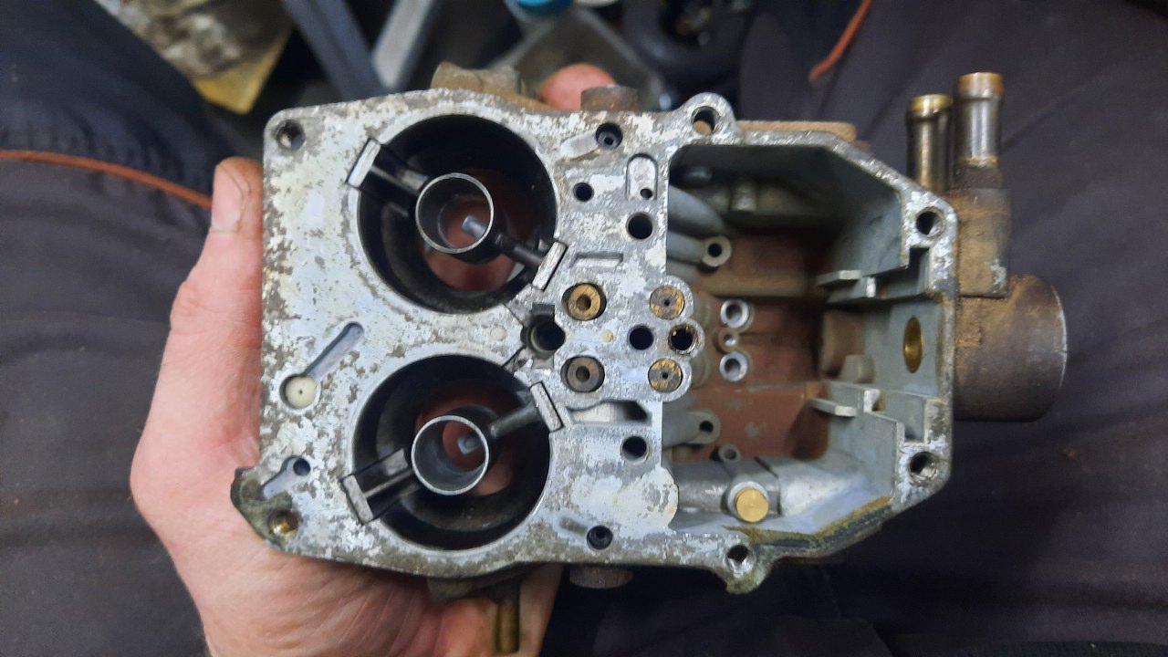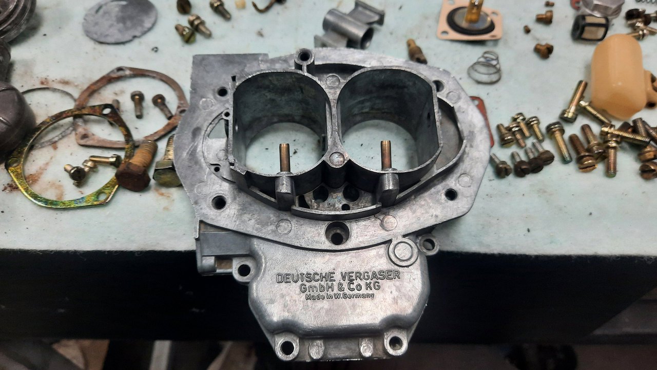 Ponieważ gaźnik chciałbym oddać dość niedługo, a nie mam czasu na dokładne odnawianie tej obudowy, to znalazłem w swoich zapasach identyczną obudowę (co nie jest oczywiste, bo było wiele odmian tego gaźnika, różniących się bardzo, bardzo drobnymi szczegółami) już odnowioną.