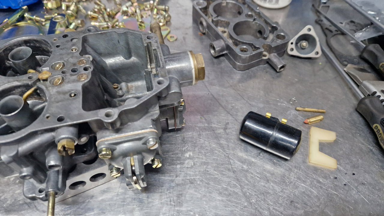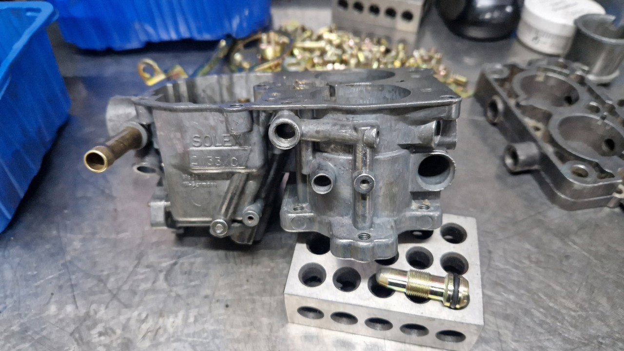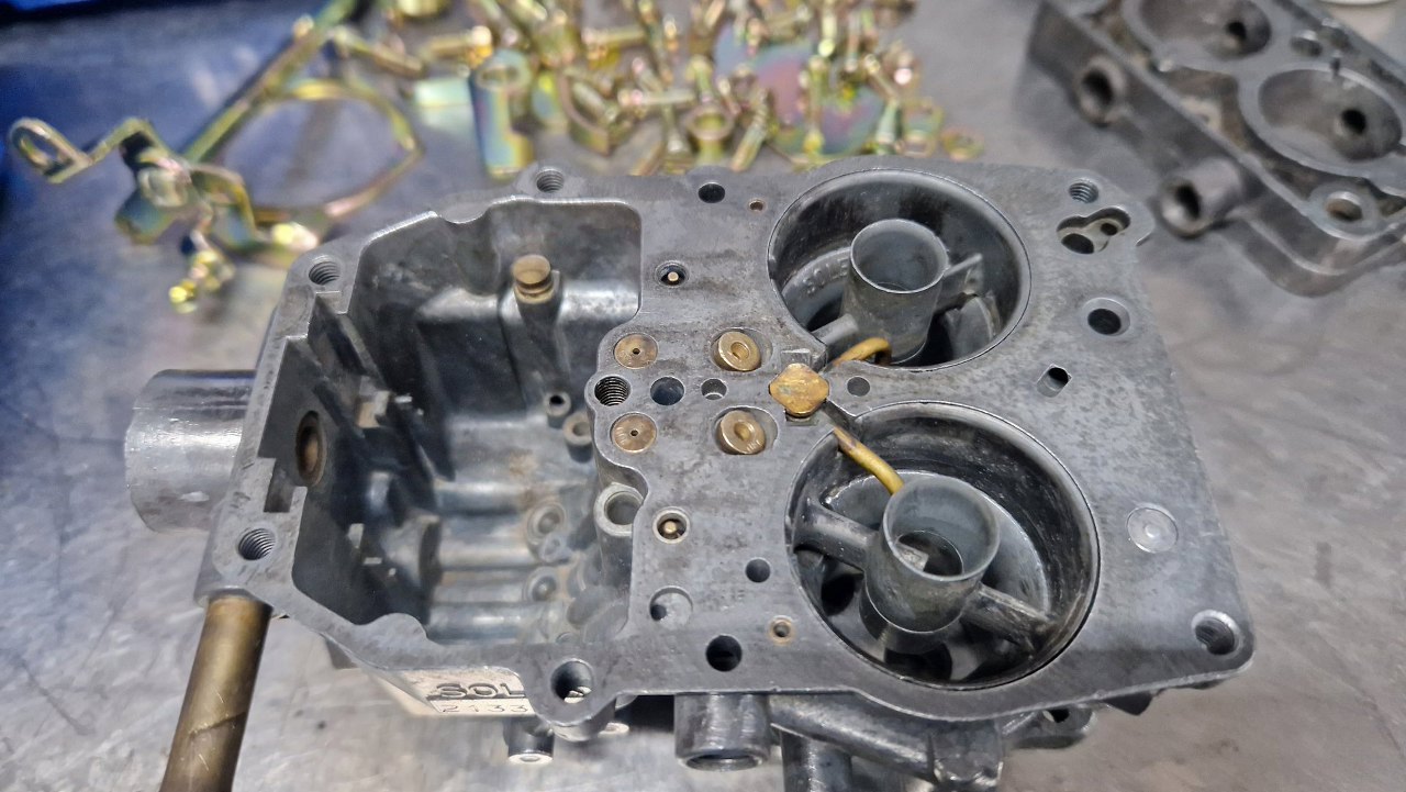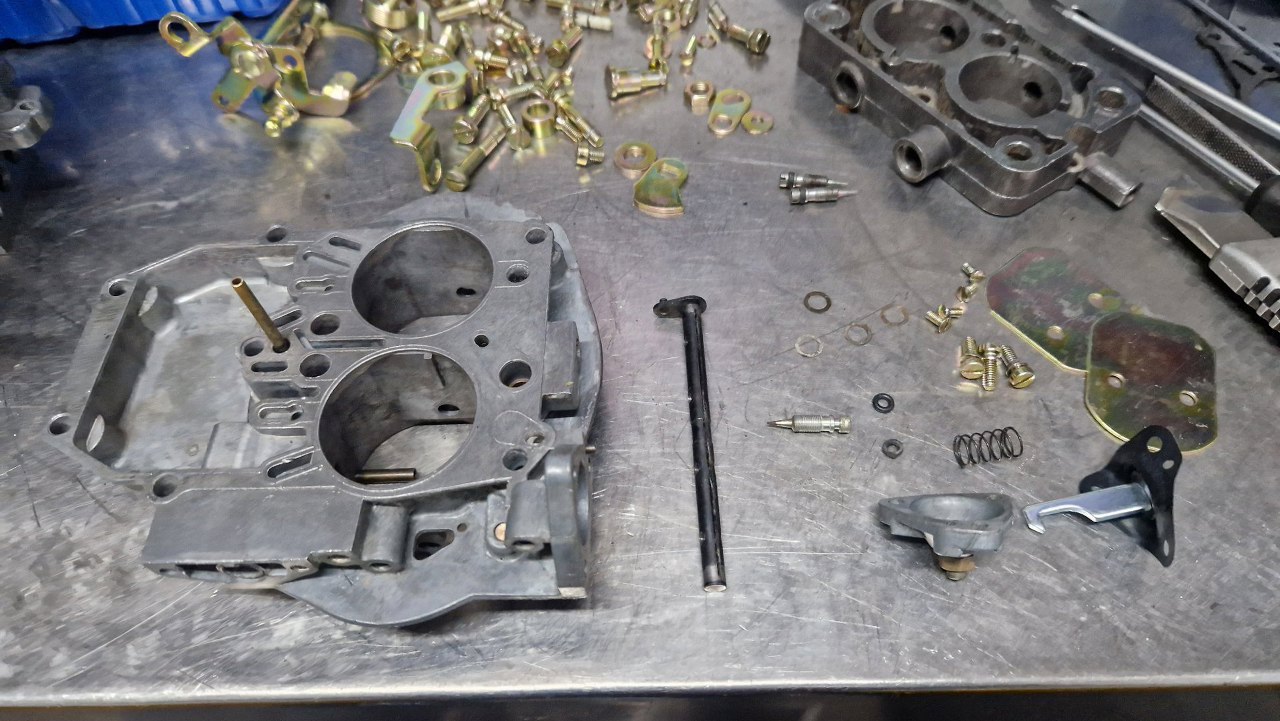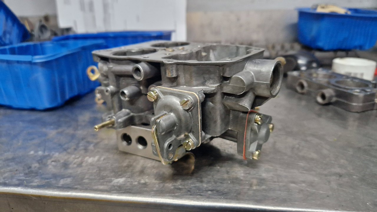 Tu trochę musiałem poczekać na części - nie miałem detali ocynkowanych w swoich zapasach i musiałem oddać do ocynku te z tego gaźnika. Obudowa była w na tyle dobrym stanie, że wystarczyło ją domyć i przedmuchać sprężarką wszystkie kanaliki. Może i nie wygląda tak dobrze, jak po szkiełkowaniu, ale tak jest bezpieczniej - nie ma ryzyka zapchania kanalików.