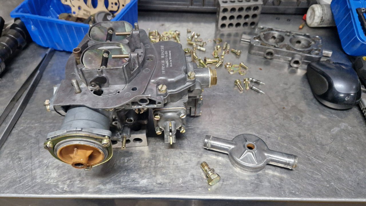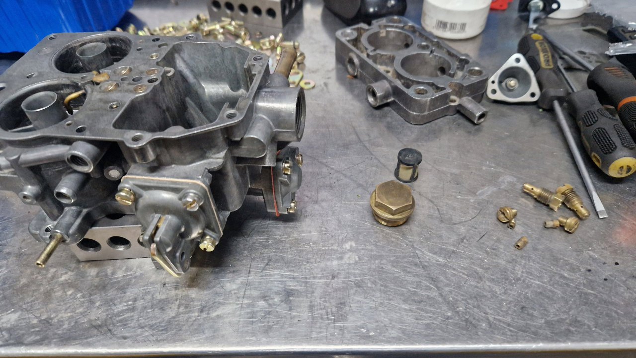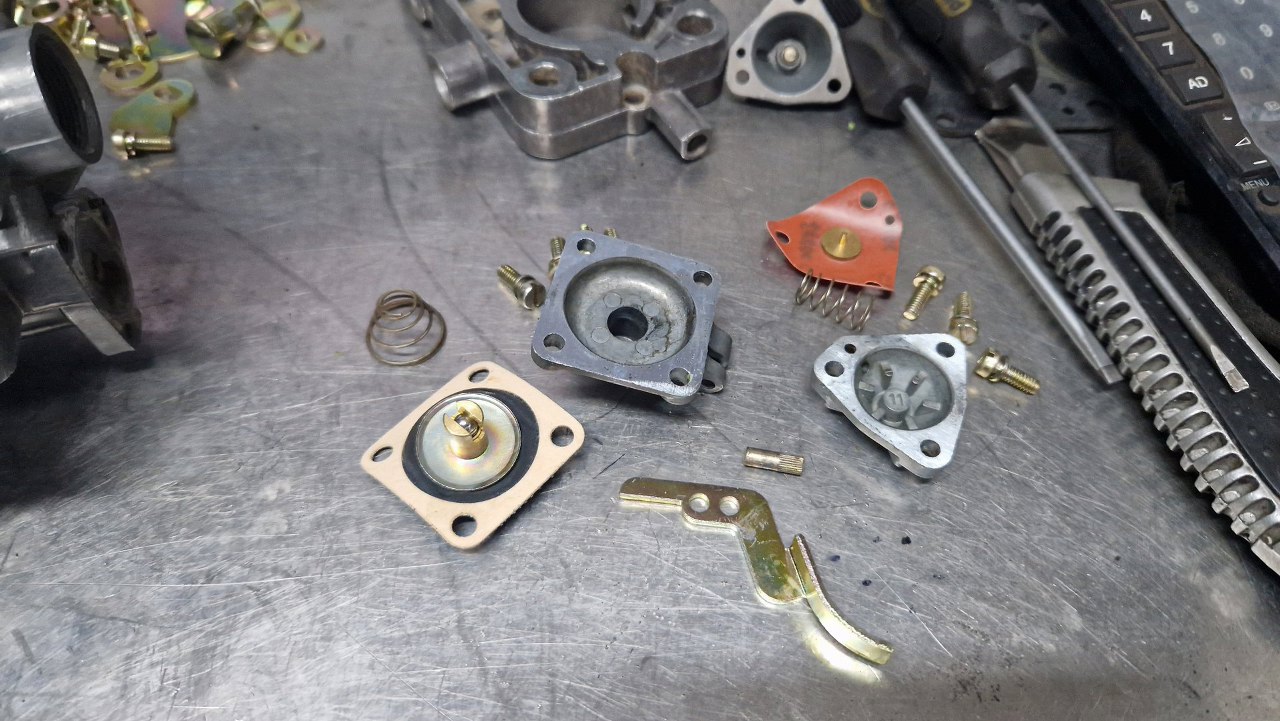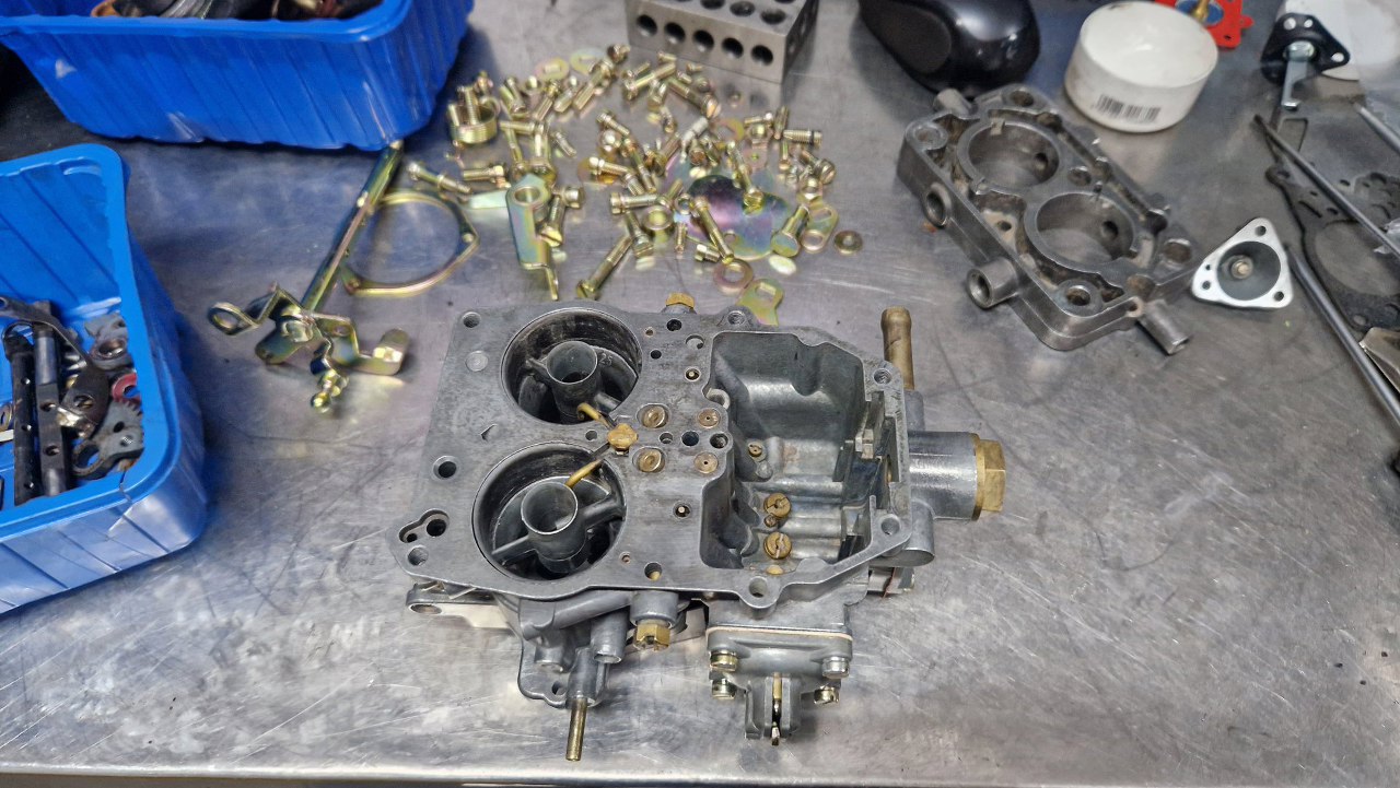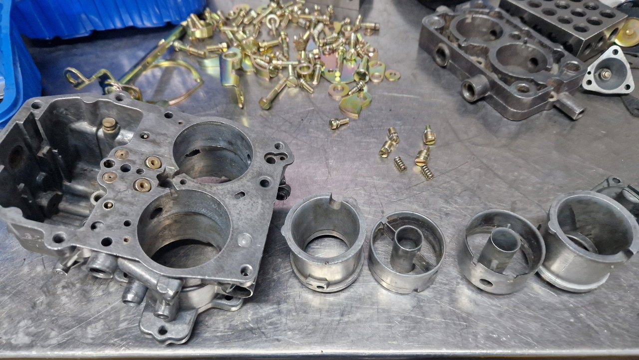 Tu trochę musiałem poczekać na części - nie miałem detali ocynkowanych w swoich zapasach i musiałem oddać do ocynku te z tego gaźnika. Obudowa była w na tyle dobrym stanie, że wystarczyło ją domyć i przedmuchać sprężarką wszystkie kanaliki. Może i nie wygląda tak dobrze, jak po szkiełkowaniu, ale tak jest bezpieczniej - nie ma ryzyka zapchania kanalików.