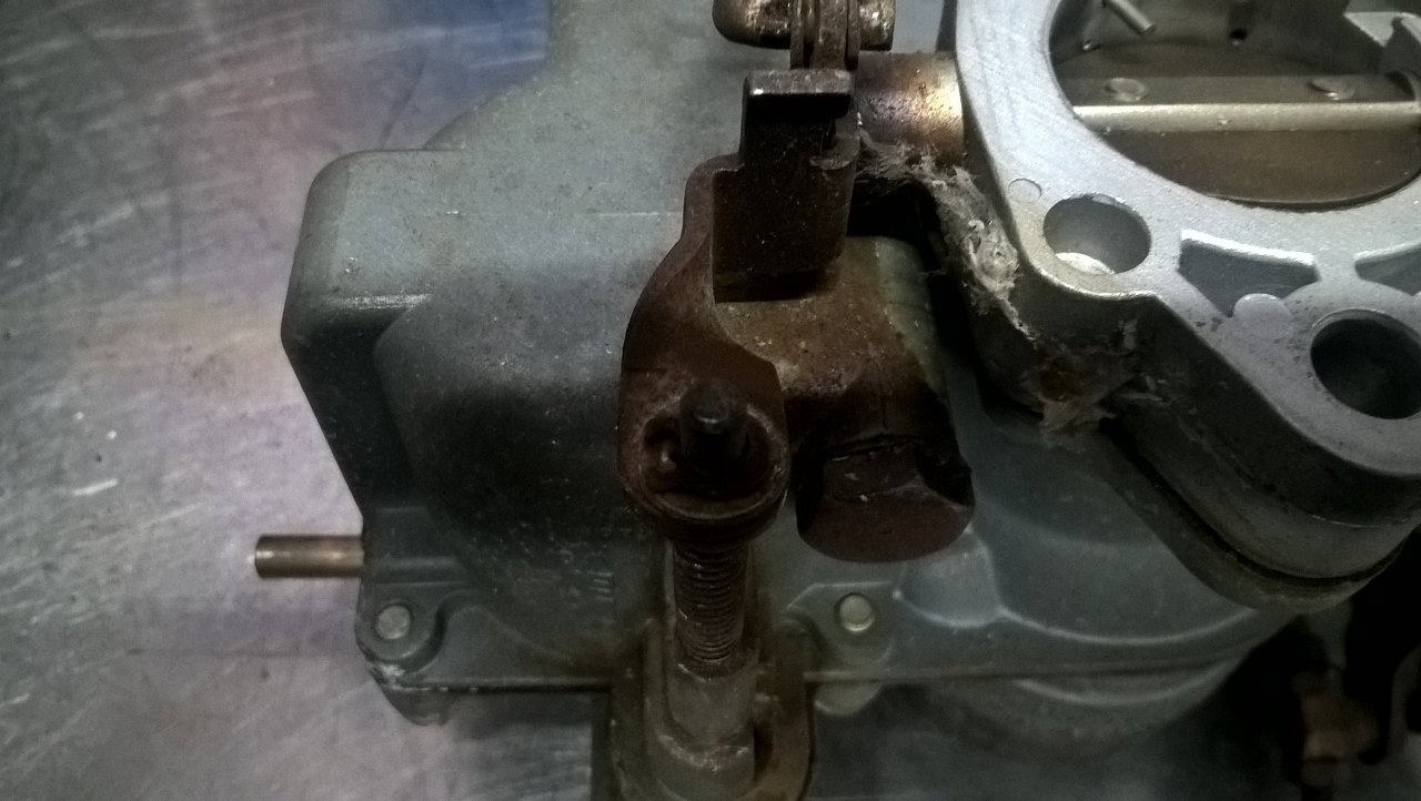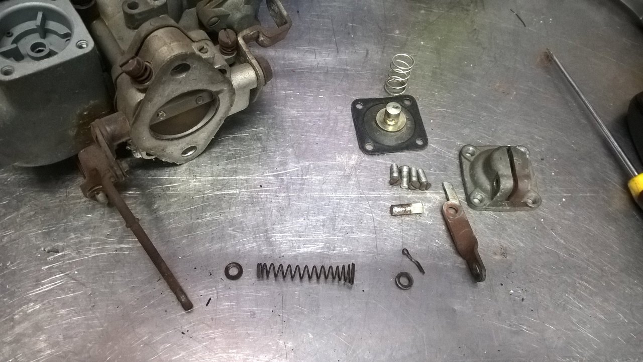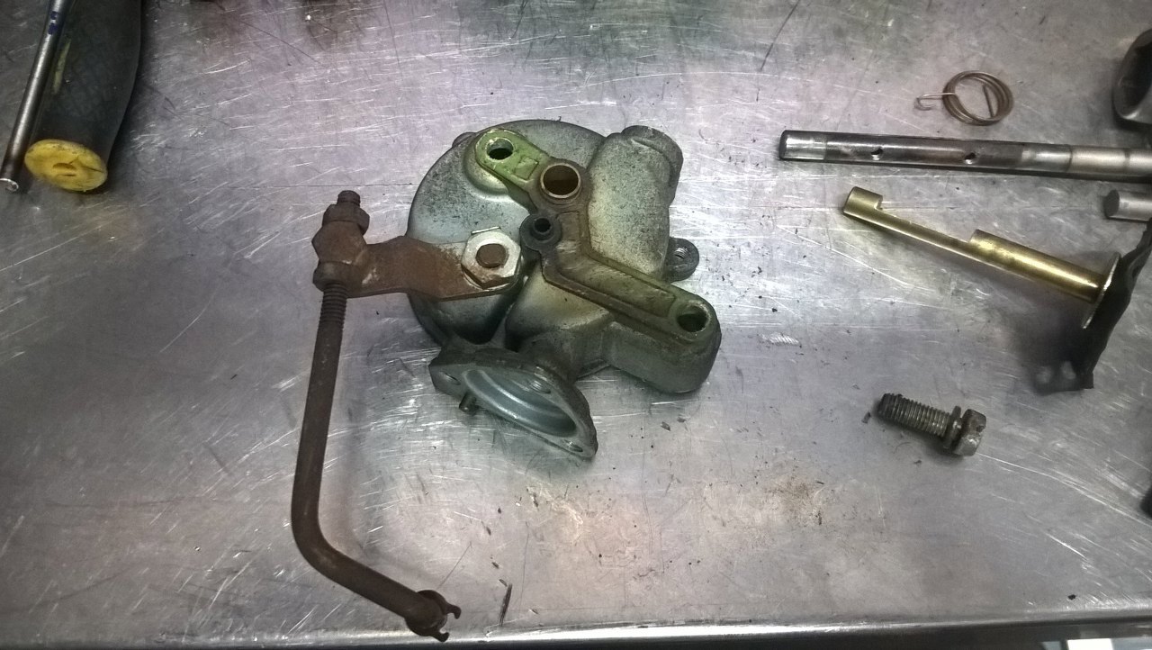 Odkręciłem pokrywkę, zdjąłem sprężynę z pręta łączącego dźwignię pompki z mechanizmem przepustnicy. Zdjąłem też dźwignię pompki z pokrywy.