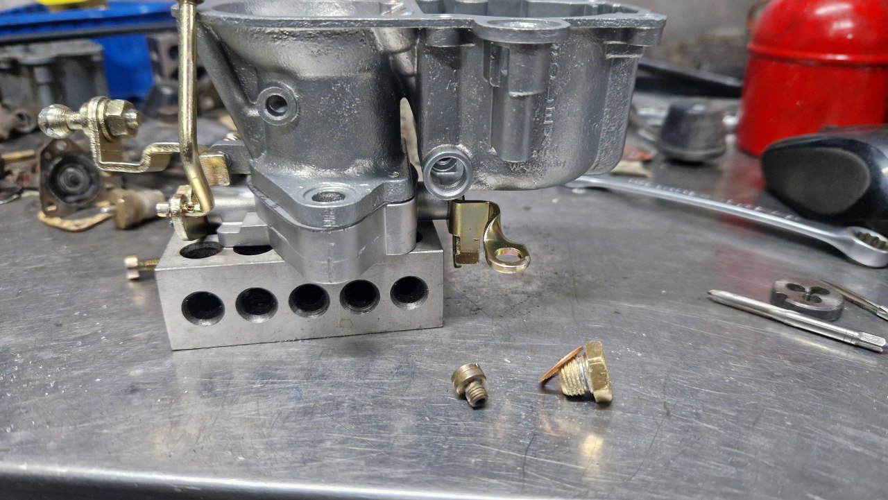 Z boku komory pływakowej wkręca się do środka gaźnika dyszę paliwową, a następnie zamyka otwór w komorze tym korkiem po prawej.