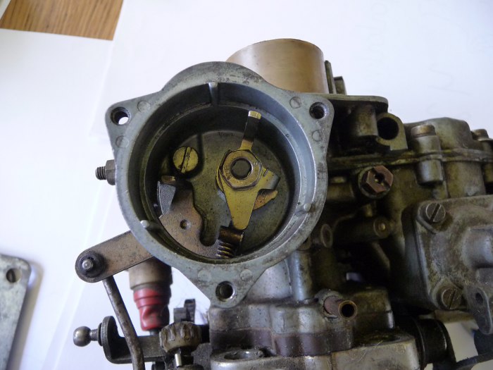 Zdjęty już cały mechanizm ssania, dobrze widać mechanizm mocujący linkę gazu i amortyzator (tak to nazwać?) gazu.