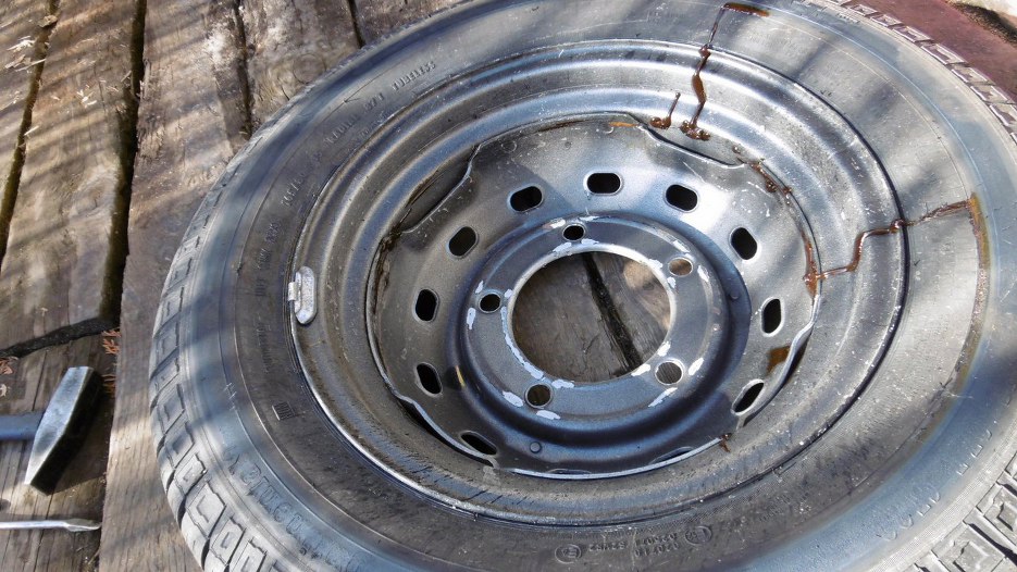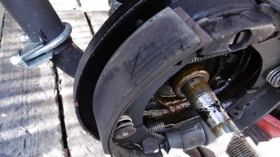 Ponieważ większość prac toczyła się równolegle, to pogrupowałem je tematycznie. Zacznę od niedziałających tylnych hamulców. Myślałem, że wystarczy dokręcić regulację szczęk, ale już była dokręcona, i to mocno. Po zdjęciu koła widać, że coś tu nie gra. Zacieki widoczne na kole to smar. Musiał nieźle się nagrzać, skoro tak wyciekł z łożysk.