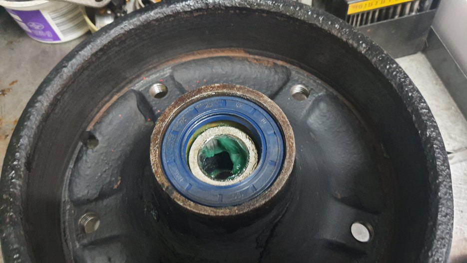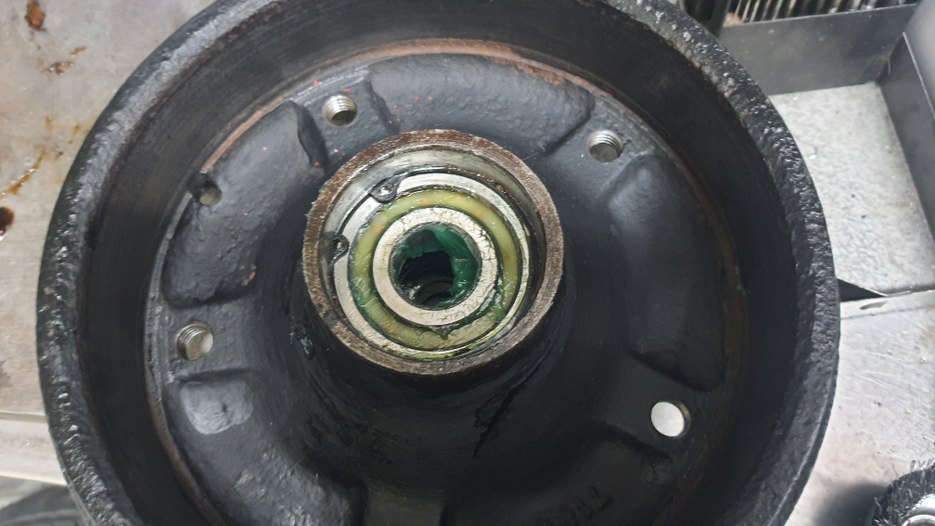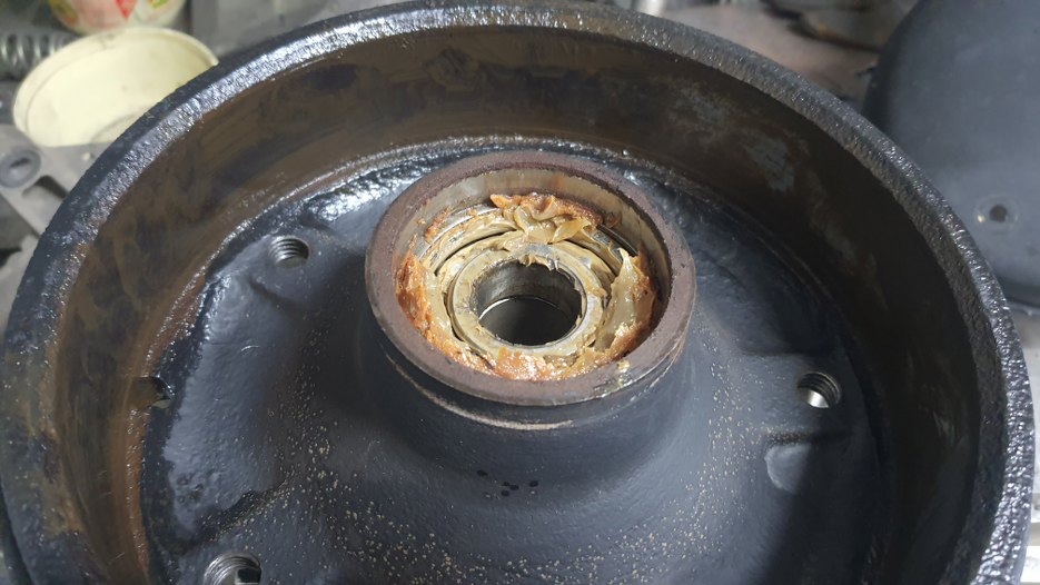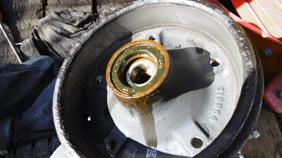 I mamy przyczyny awarii. Nie wiem, czy cokolwiek widać, ale nie da się lepiej zdjęcia zrobić. Płaszczyzna, po której pracuje simmering jest uszkodzona. Stary smar nagrzał się przy hamowaniu, czy też nawet tylko toczeniu łożysk, i wyciekł przez te uszkodzenie. Zatłuścił szczęki. Żeby hamowało, regulacją dokręcono szczęki, przez co jeszcze bardziej się grzało i więcej smaru wyciekło...