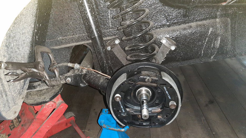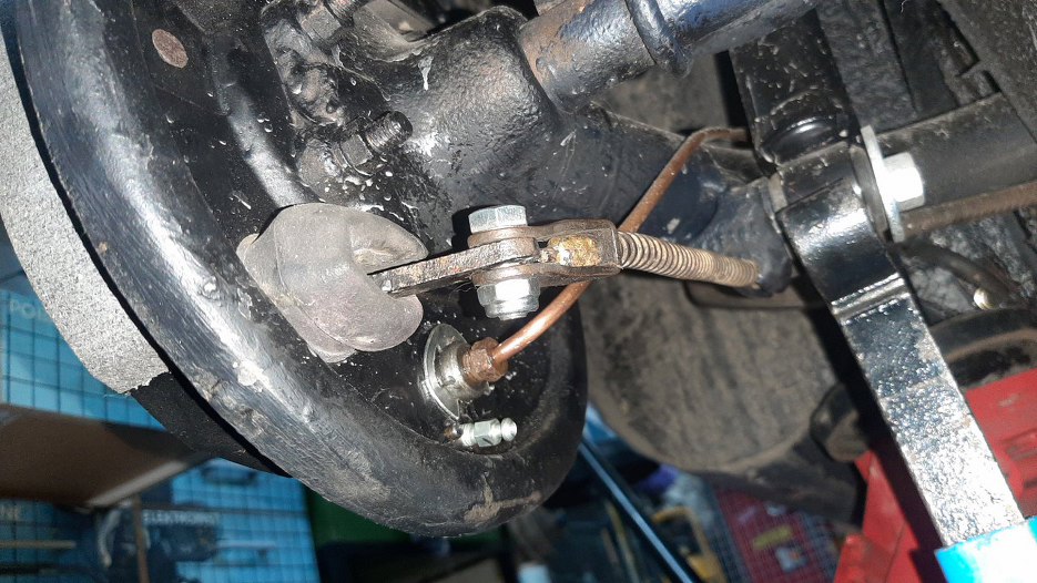 I założony. Widać, że teraz jest właściwy pierścień sprężysty założony. Widać też, że brakuje oryginalnych pinów mocujących linkę hamulca ręcznego do mechanizmu, zastąpione zostały śrubą. To zostawiam na następny raz, razem z wymianą tych gumek osłaniających.