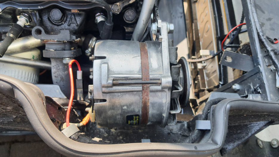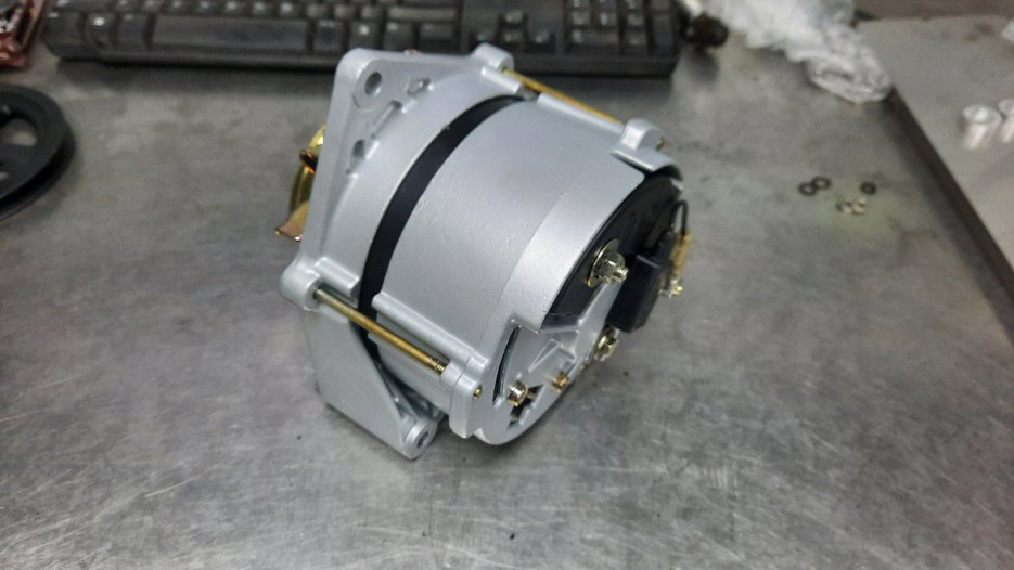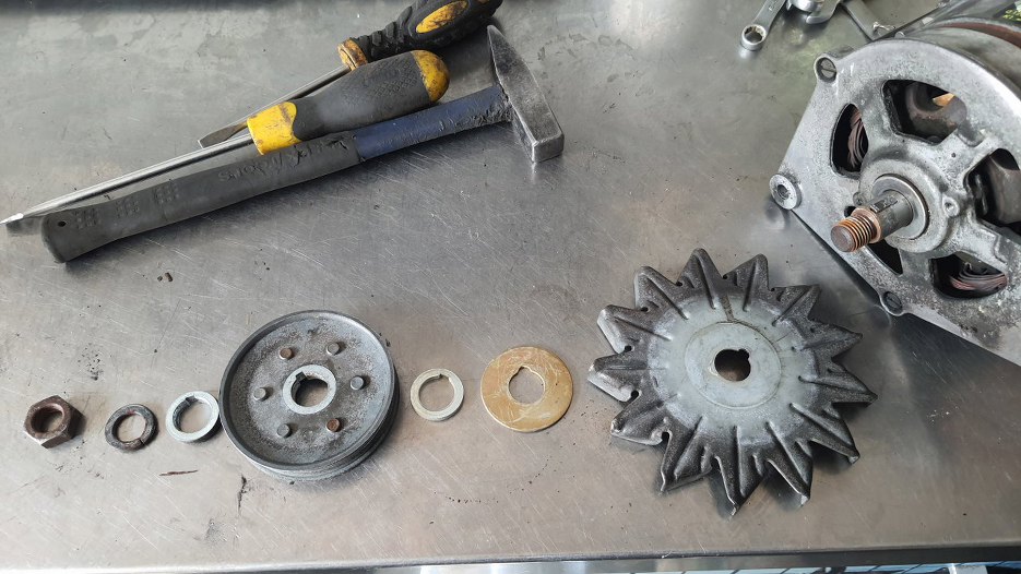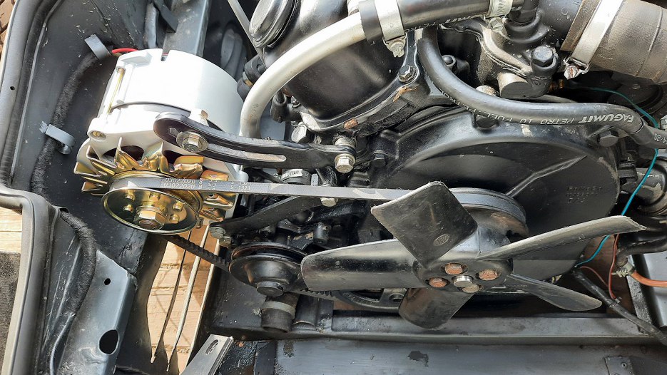 Potem założyłem alternator na miejsce. Dotarło już też koło pasowe silnika i wiatrak, więc tą część pracy mamy za sobą.