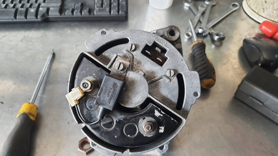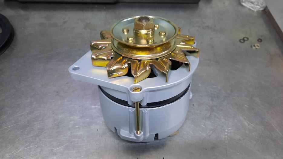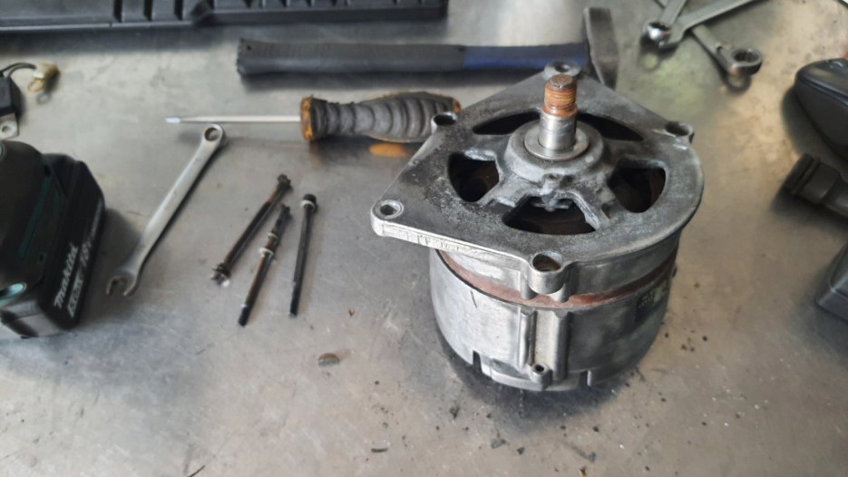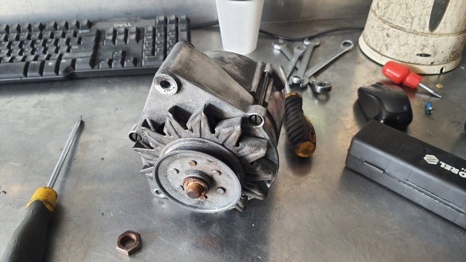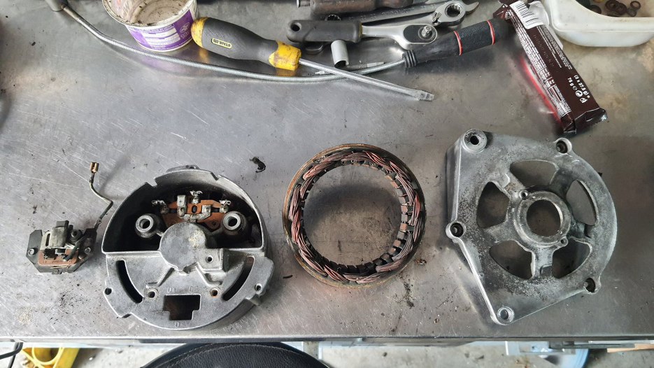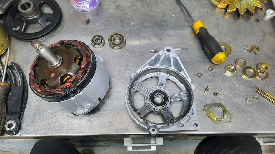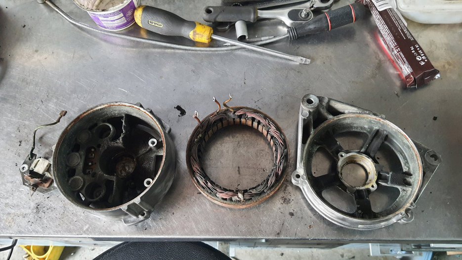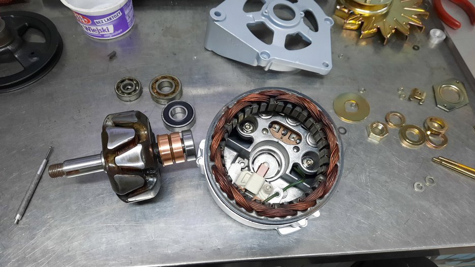 Chłodnicę oddałem do naprawy, ale że była za wąska na Sonetta, to od razu dałem drugą na wzór, żeby zrobili taką, jak trzeba - szerszą. Potem, w trakcie czekania na części (koło pasowe i wiatrak) sprawdziłem alternator - łożyska chrzęściły podczas kręcenia. Oczywiśnie nie jest to związane z kołem pasowym, ale skoro już jest zdjęty pasek, to równie dobrze można wymienić łożyska w alternatorze. Zapytałem czy tylko wymieniamy łożyska, czy robimy alternator w/g moich standardów. Robimy...