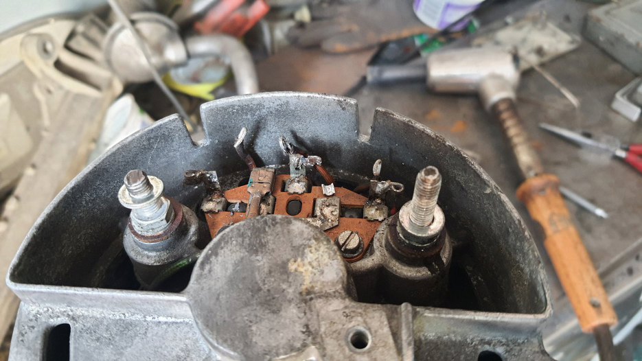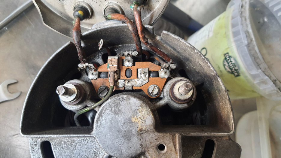 Tu widać szczotkotrzymacz w obudowie. Oczywiście są wlutowane nowe szczotki. Wirnik też odnowiony, założone nowe łożysko.
