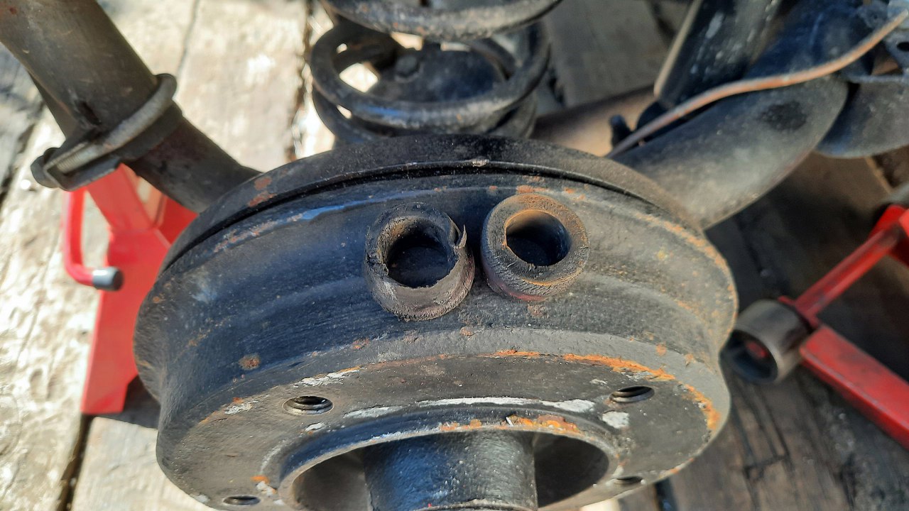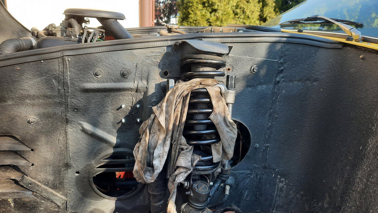 Żeby wyjąć sprężynę, najprościej jest odkręcić jej dolne mocowanie z wahacza. Trzyma ono również sworzeń.