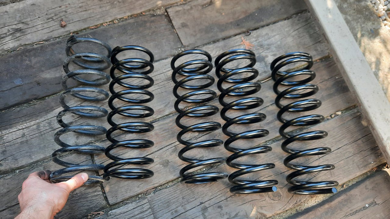 Nowe sprężyny rzeczywiście są krótsze (pierwsza z lewej to stara tylna, dwie kolejne to nowe tylne), ale mają tą samą grubość drutu. Saab powinien być niższy po wymianie.