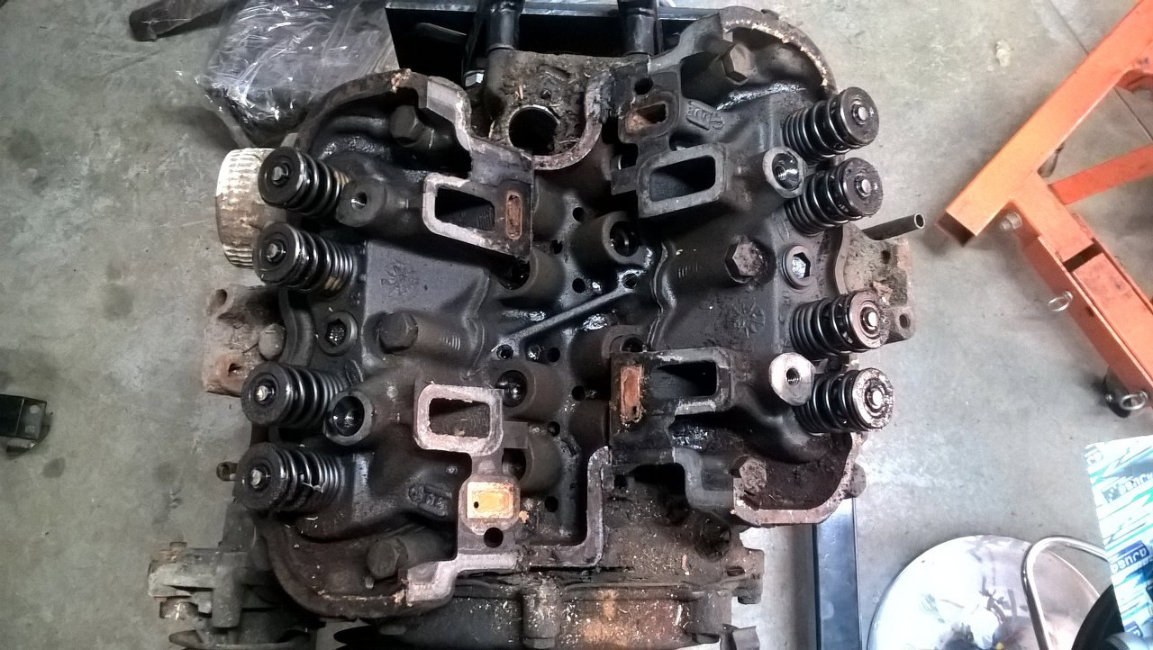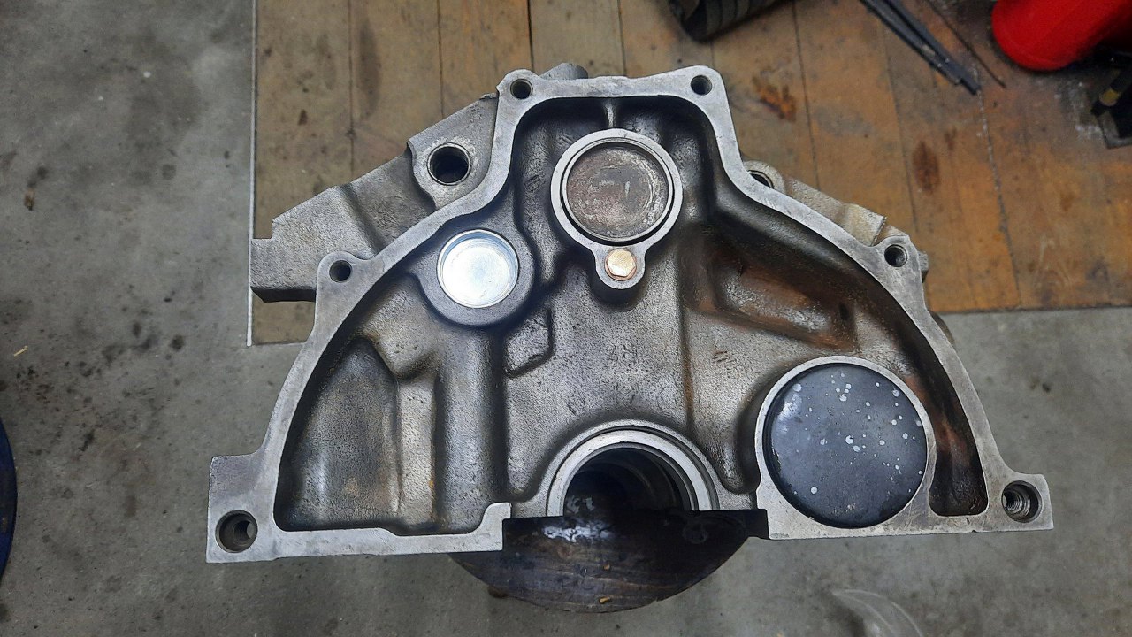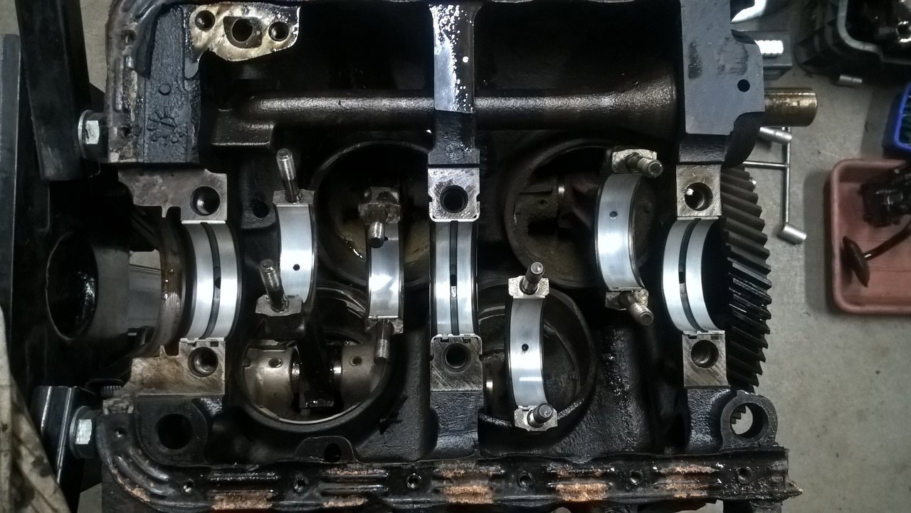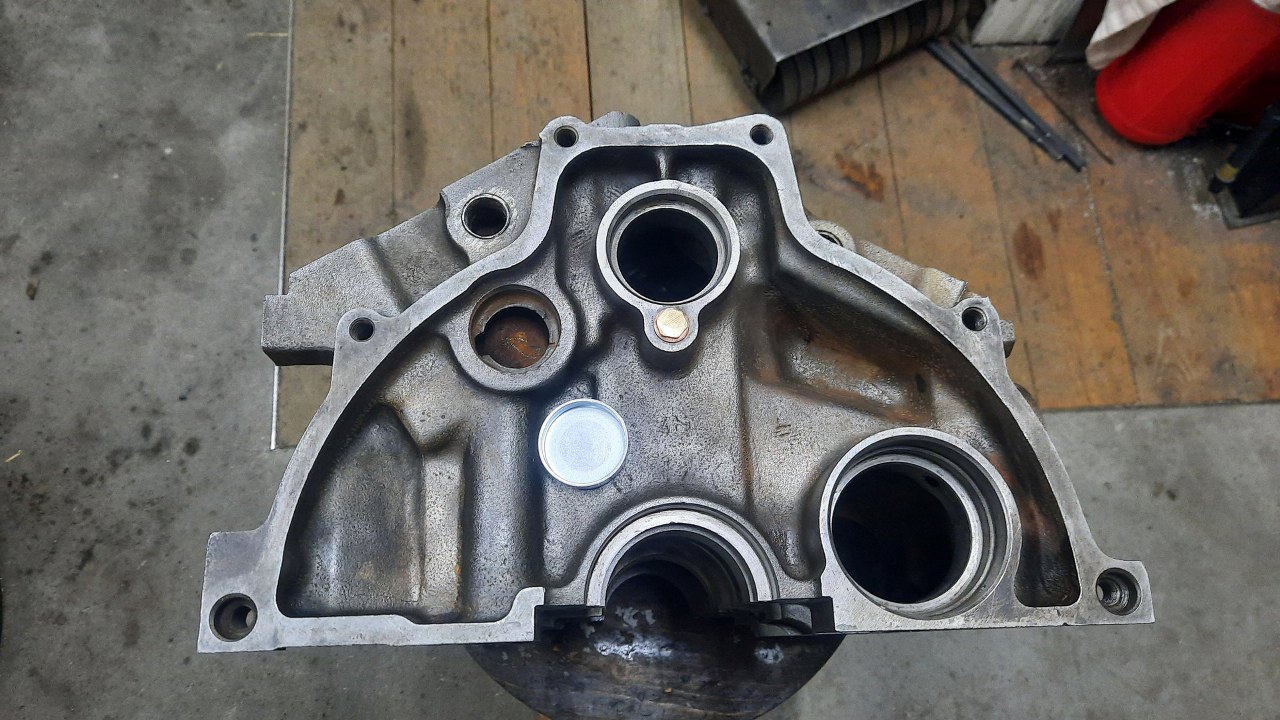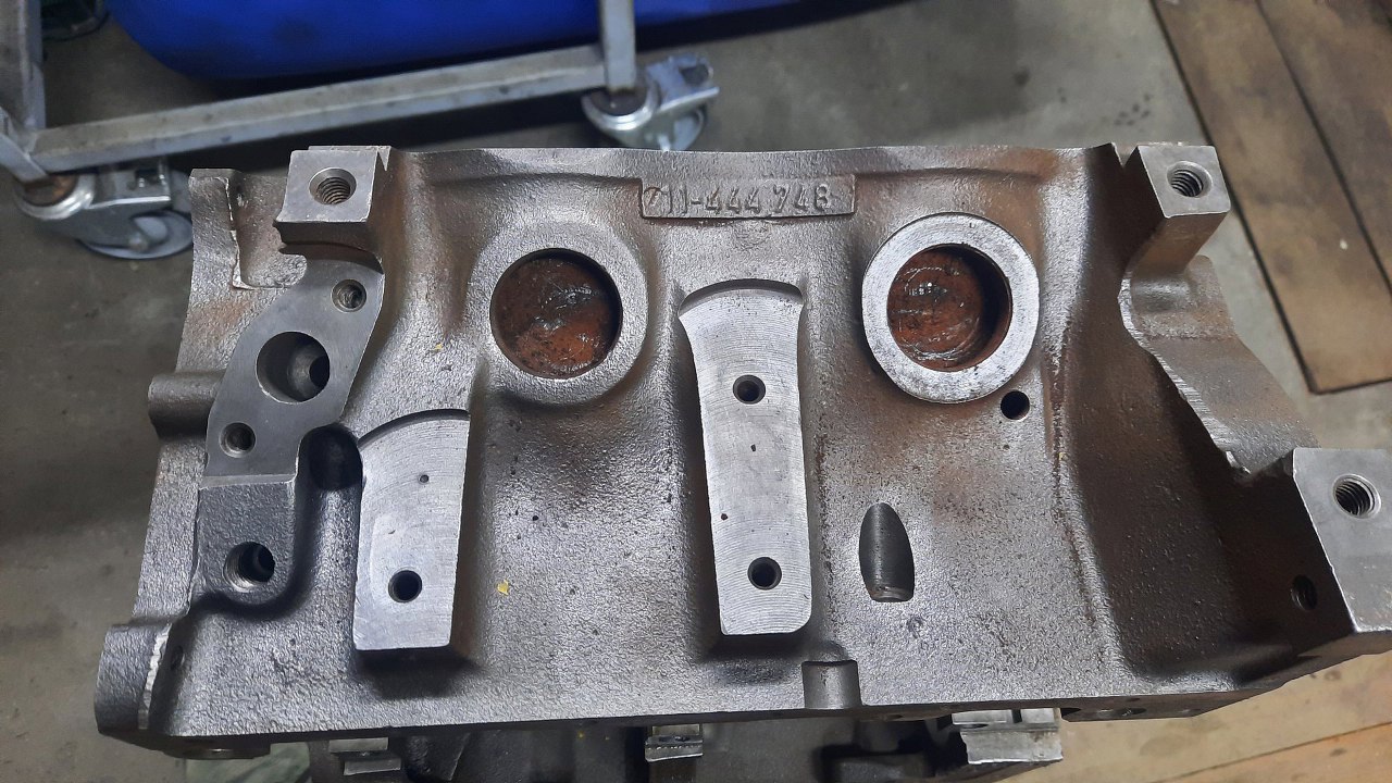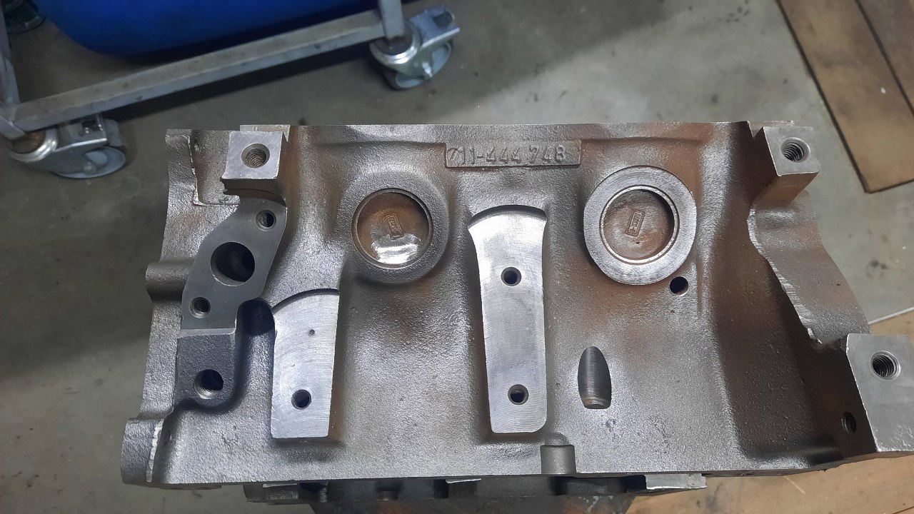 W szlifierni zostały rozwiercone cylindry (sporo, bo oryginalnie miały 90mm), wyważony cały układ korbowy, szlifowane koło zamachowe (widać, że jest inne, niż na poprzednim zdjęciu, zmieniłem je w międzyczasie). Po wstępnym pomierzeniu głowic (co będzie odrębnym wątkiem) i wynikających z tego ustaleniach na temat docelowego pożądanego stopnia sprężania, odpowiednio splanowana została też płaszczyzna bloku pod głowice.