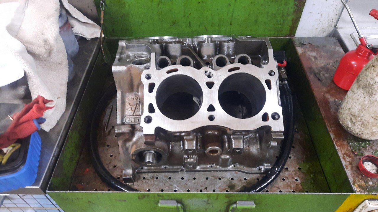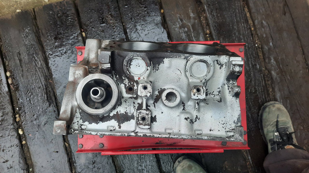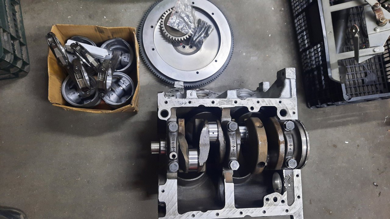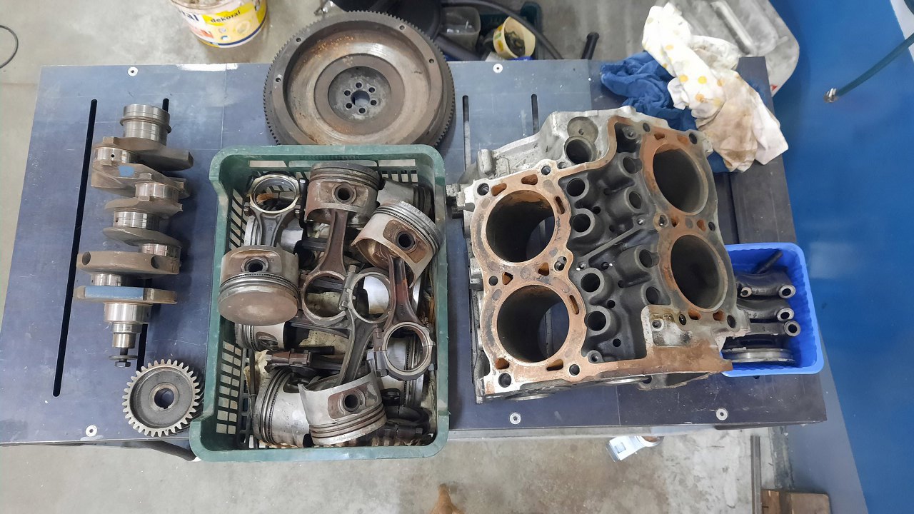 Od rozłożenia tego silnika do rozmowy wspomnianej na początku strony minęło sporo czasu. Dlatego żeby zbudować ten silnik, to pozbierałem trochę rzeczy - blok (pierwszy z brzegu, z najgorszymi cylindrami, bo i tak będzie sporo rozwiercany), wał korbowy (akurat z tego silnika), tłoki 93mm. Taki zestaw zawiozłem do szlifierni.