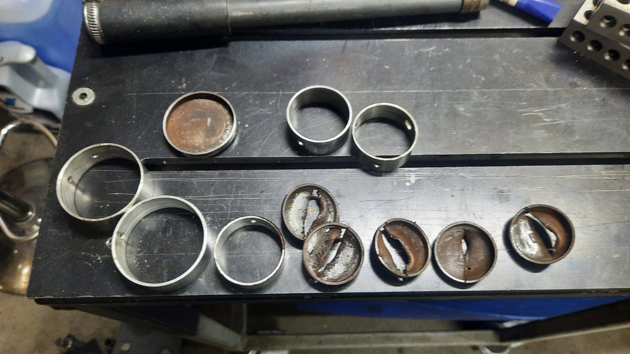 Wybiłem też panewki wałka rozrządu i wyrównoważającego. I tu kolejna ciekawostka o tym bloku - ktoś to kiedyś naprawiał, bo panewki są dorobione z aluminium! Co z tego, że te panewki są dostępne, widocznie ktoś tego nie wiedział Szanuję mocno tokarza, który to dorobił - wymaga to naprawdę dobrej dokładności wymiarów. Ale tak dorobione panewki są za słabe. Oryginalnie panewki oczywiście mają warstwę aluminium, ale są na rdzeniu ze stali.