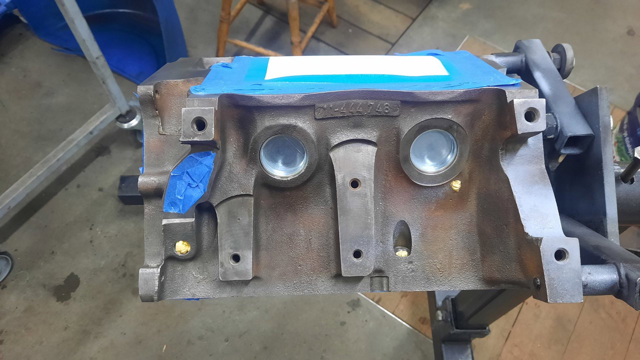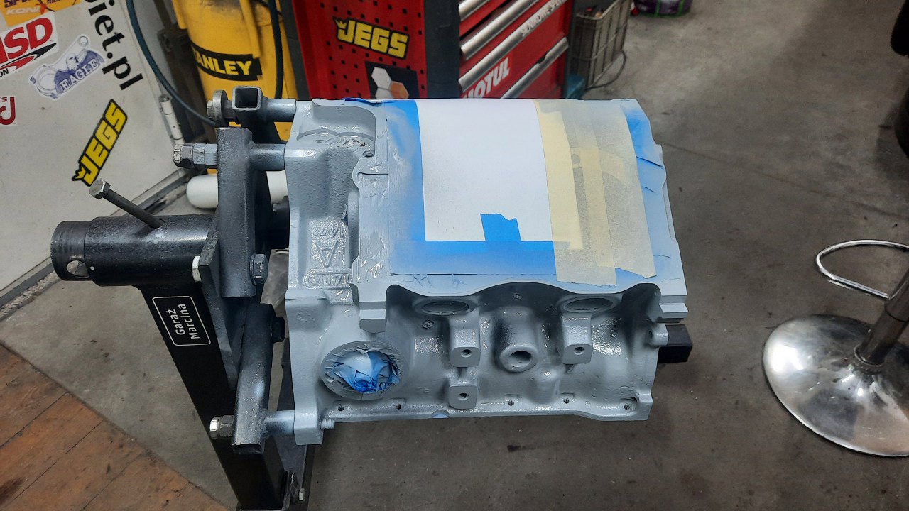 Zaślepki otworów na wałki na razie są tymczasowe, żeby podczas malowania nie wpuścić lakierów do środka bloku.