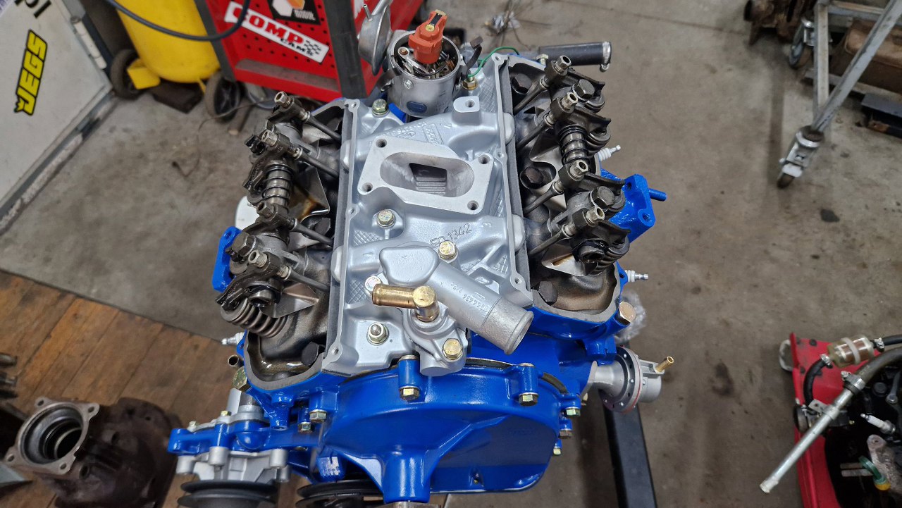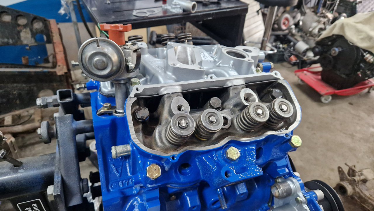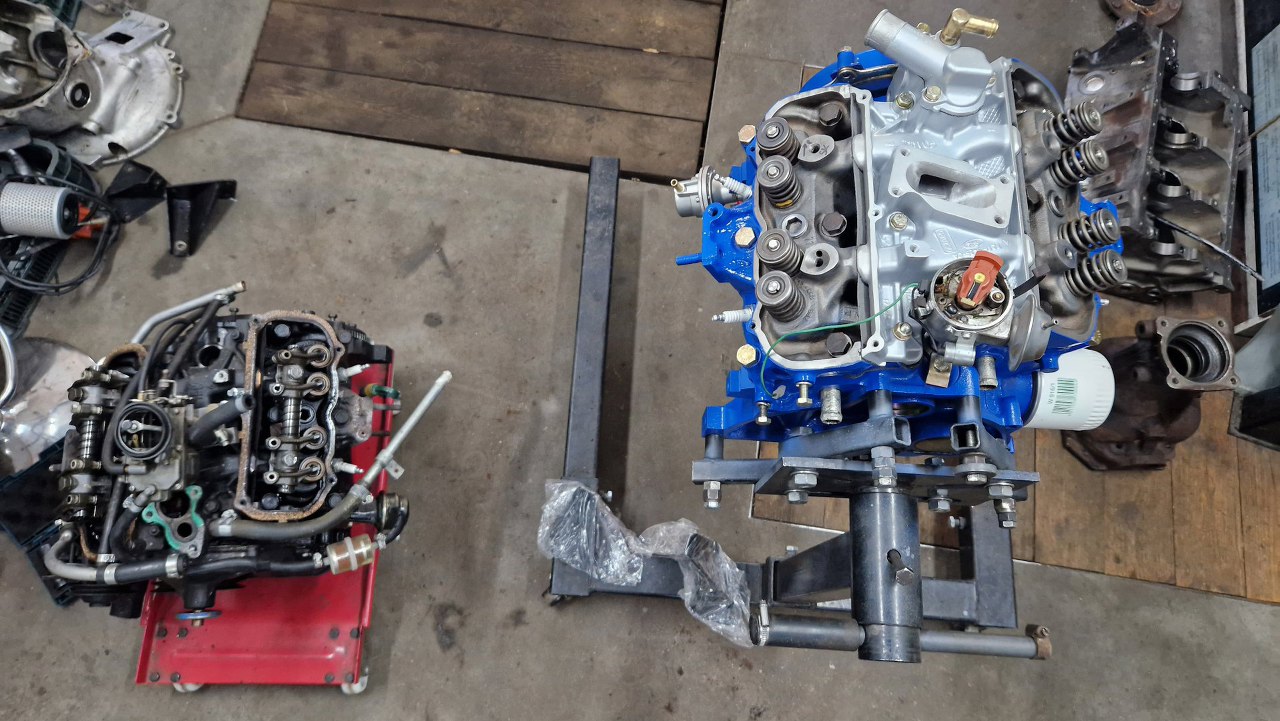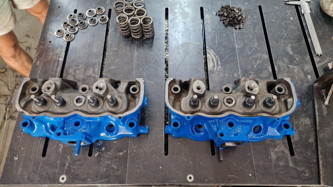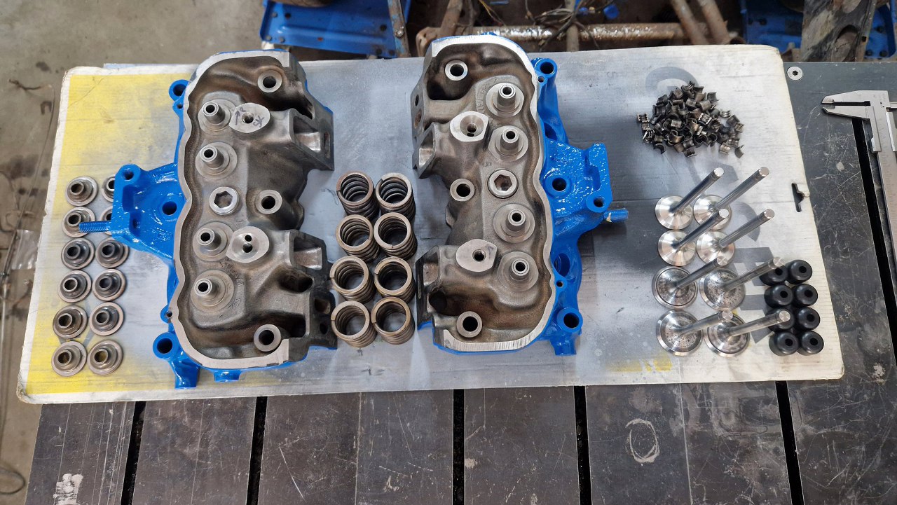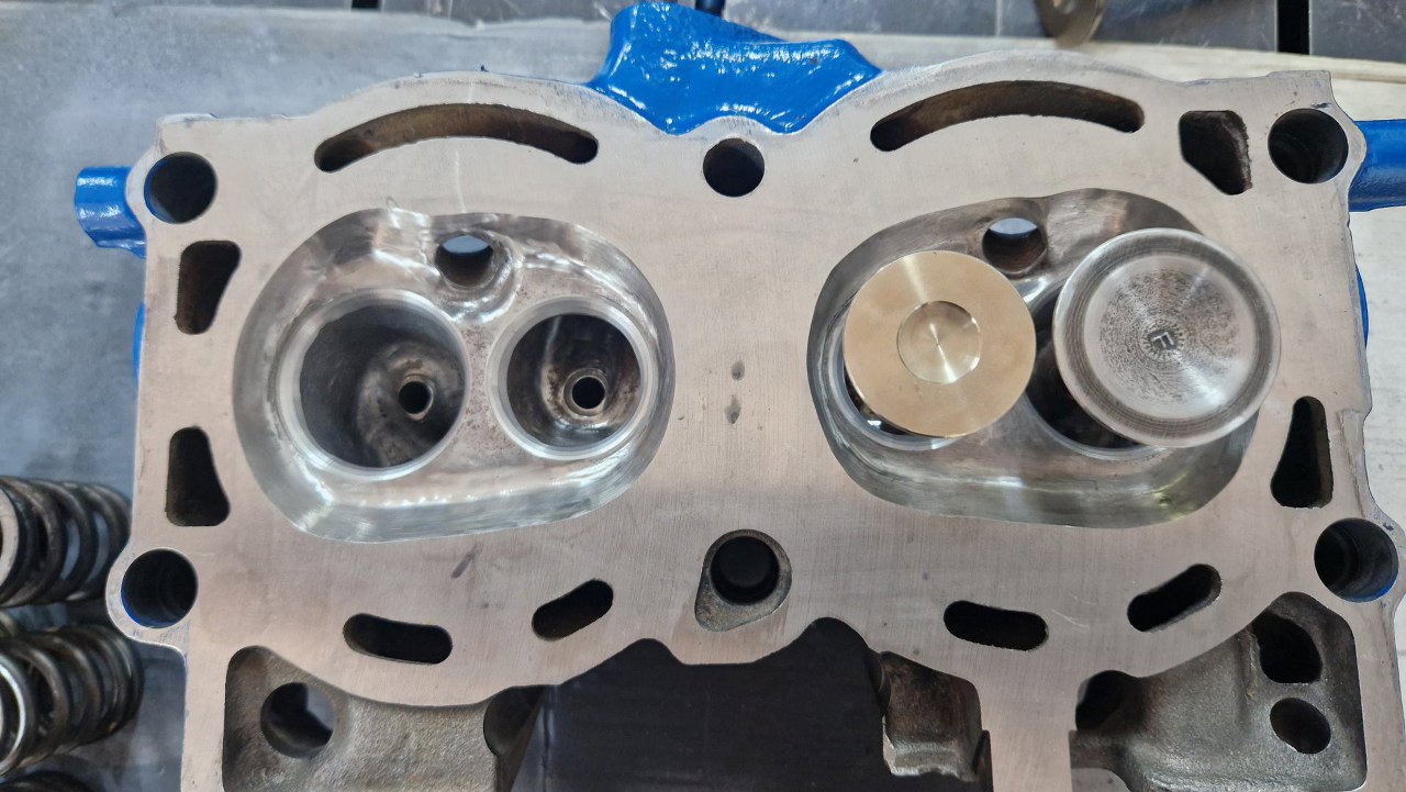 Tu trochę widać, ile było pracy z głowicami. Przypomnę, że zawory są o 4mm na średnicy większe od oryginalnych. CO oznacza, że było bardzo dużo frezowania do wykonania w kanałach, które są teraz odpowiednio powiększone. Komory spalania też są dość mocno zmodyfikowane. Każda z komór została zmierzona i dopasowana tak, żeby miały tą samą pojemność.