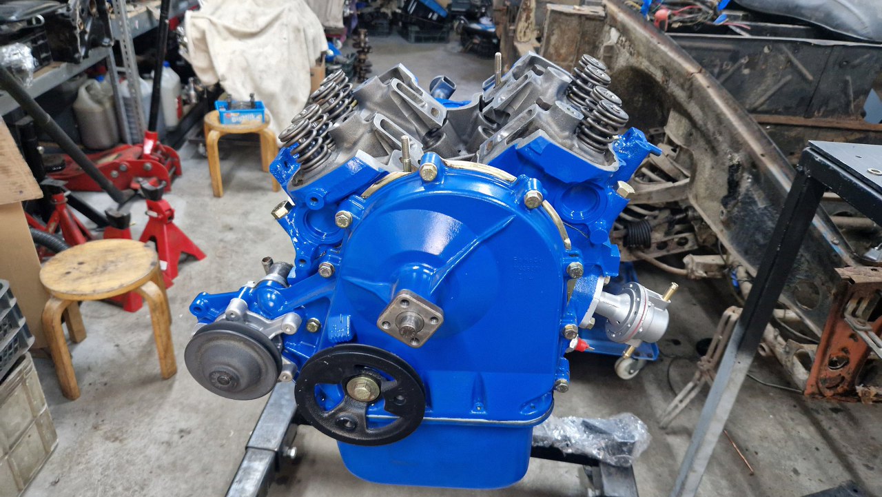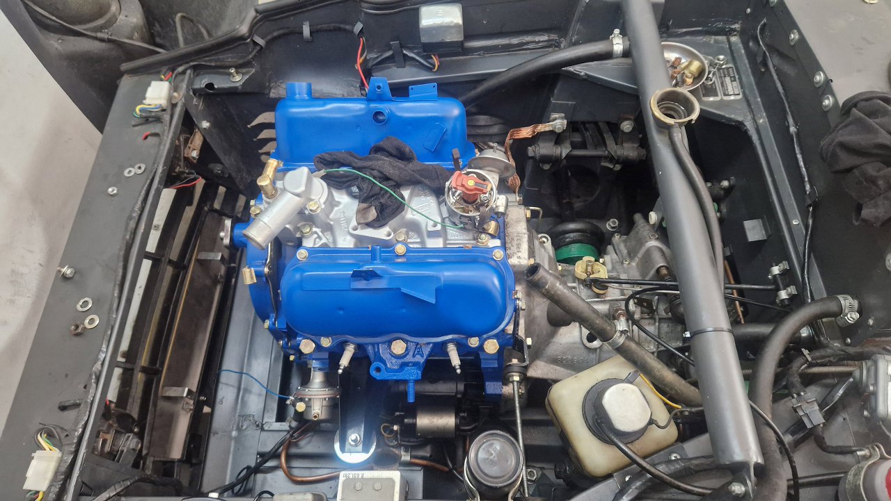 Silnik trafił na miejsce na skrzyni biegów. W tej uniesionej pozycji przykręcę jeszcze rozrusznik, bo jest łatwiejszy dostęp, i dopiero potem opuszczę silnik na jego poduszki.