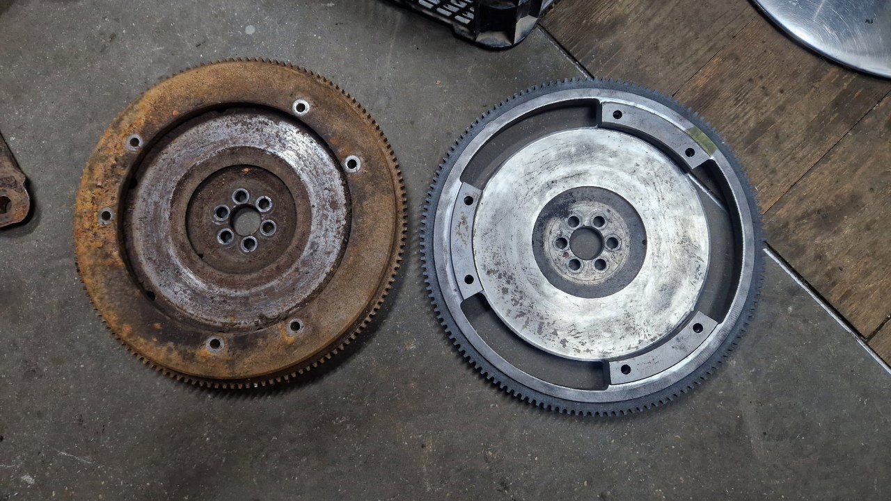 Fabryczne koło, po lewej, waży 7,2kg, koło po modyfikacji - 4,4kg. Jakieś 40% mniej. Ale - komplet koło, docisk, tarcza waży orygnalnie 10,8kg, a po modyfikacji 8kg. To wszystko trochę było zrobione na oko, ale proporcje mi się podobają. Ten silnik powinien się dobrze wkręcać.