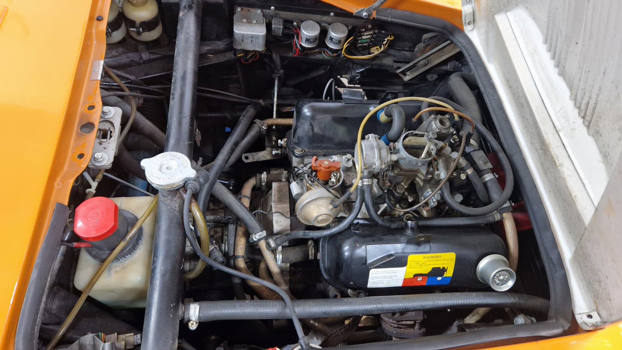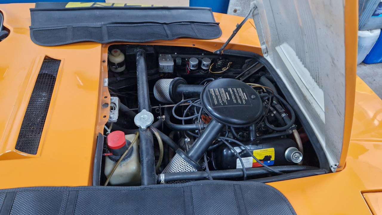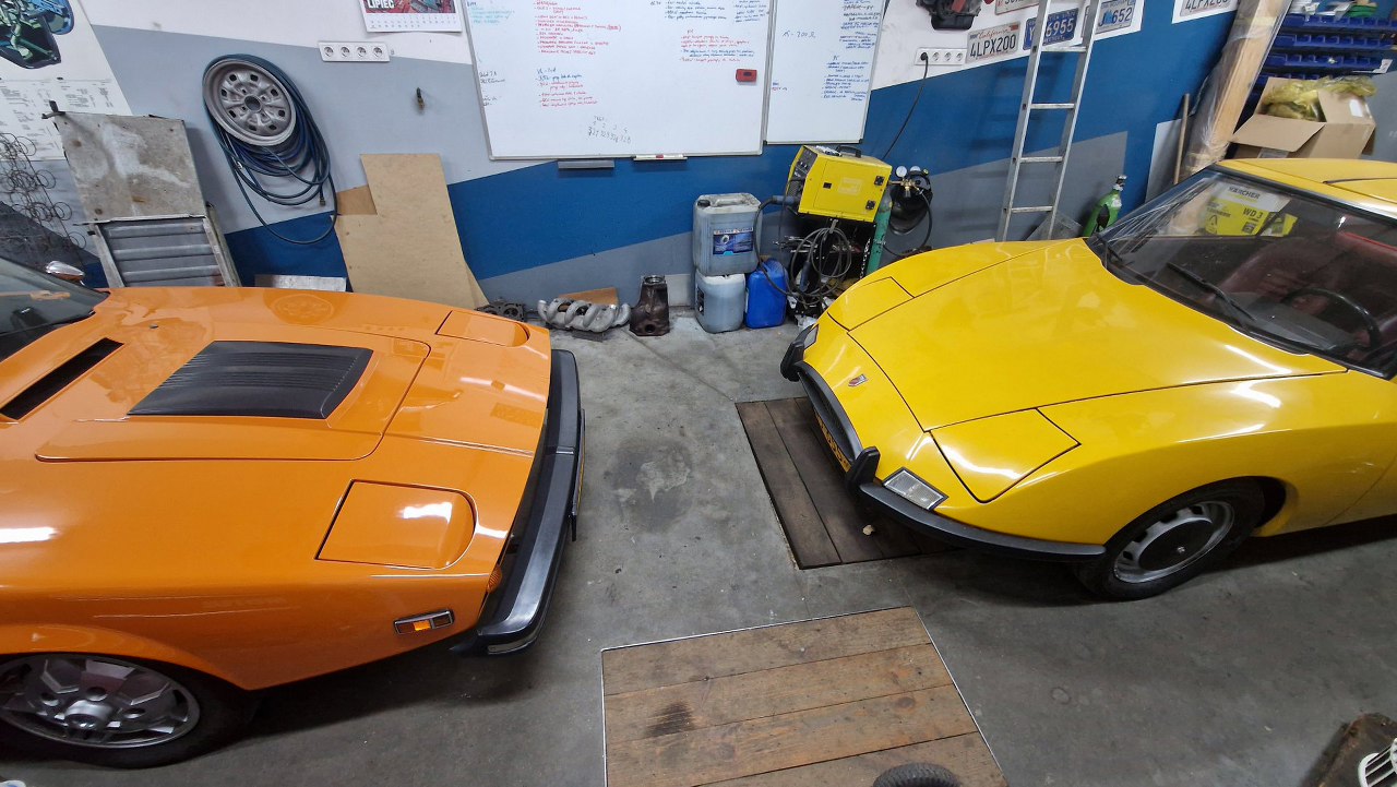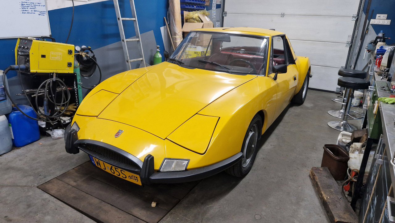 Jako ciekawostka - tuż obok stoi zupełnie inny samochód, ale: też z laminatu, też dwuosobowy (no dobra, ma tylną kanapę, ale nadal - jest dwuosobowy), też z otwieranymi lampami, i - też z V4 z Forda.