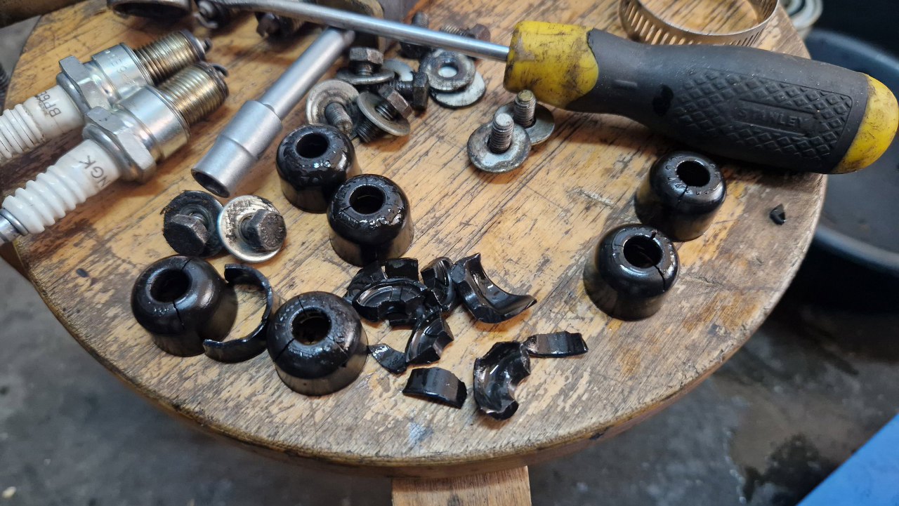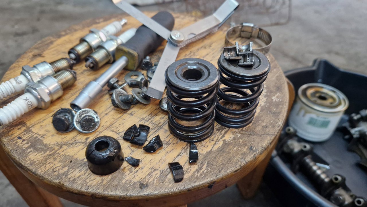 Postanowiłem więc zajrzeć i wyreglować zawory. Tu natknąłem się na niespodziankę - fragmenty uszczelniaczy zaworowych obok zaworów. No, może nie jest to taka niespodzianka, nie widzę tego w końcu pierwszy raz :).