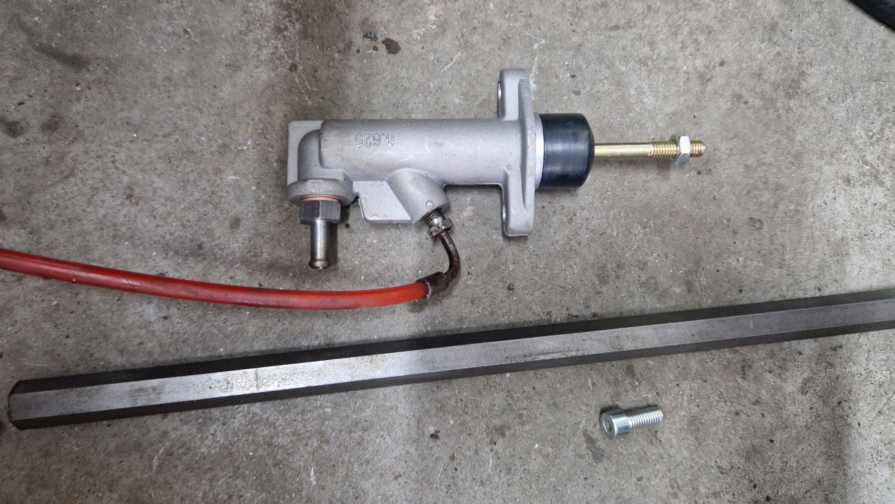 Nowe pompki sprzęgła tego typu do Saaba są niedostępne, więc użyłem uniwersalnej o tej samej średnicy tłoczka. Musiałem tylko dorobić króciec widoczny po jej lewej stronie, na końcu, do podłączenia zbiorniczka płynku. Króciec dotoczyłem z pręta sześciokątnego.