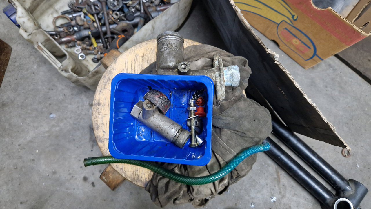 Chciałem też wymienić płyn hamulcowy w sprzęgle, ale po odkręceniu odpowietrznika w wysprzęgliku nacisnąłem pedał sprzęgła i już tak został. Wykręciłem zatem pompkę sprzęgła...