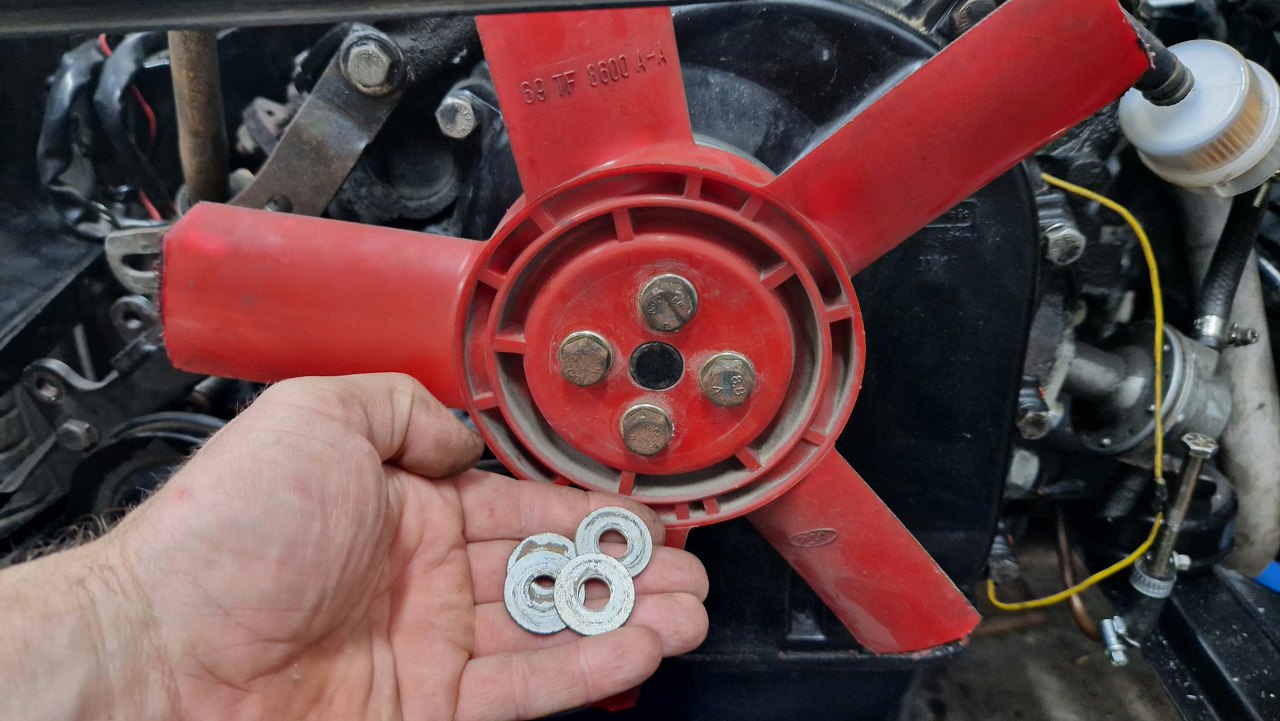 Przykręcając wiatrak wymieniłem jeszcze nieoryginalne, za duże podkładki, na właściwego rozmiaru.