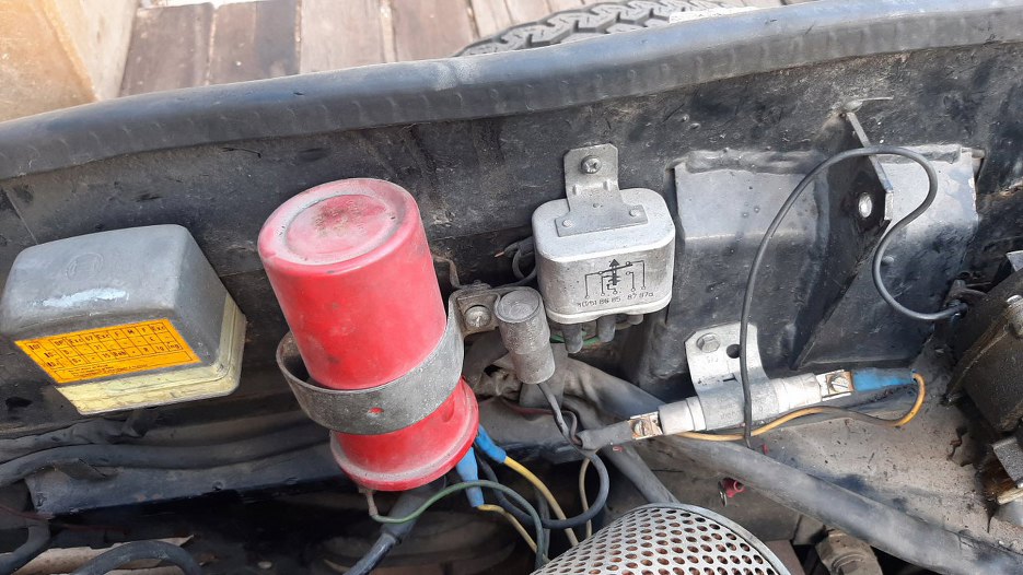 Po stronie pasażera mamy elektrykę bardziej związaną z samym silnikiem - od lewej - regulator napięcia i cewka. Dalej jest przekaźnik klaksonu i rezystor balastowy.
