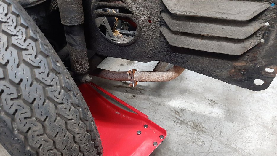Stwierdziłem, że na rozgrzewkę zdemontuję układ wydechowy. Pierwszy element łączy się z rurami tuż przed przednim kołem.