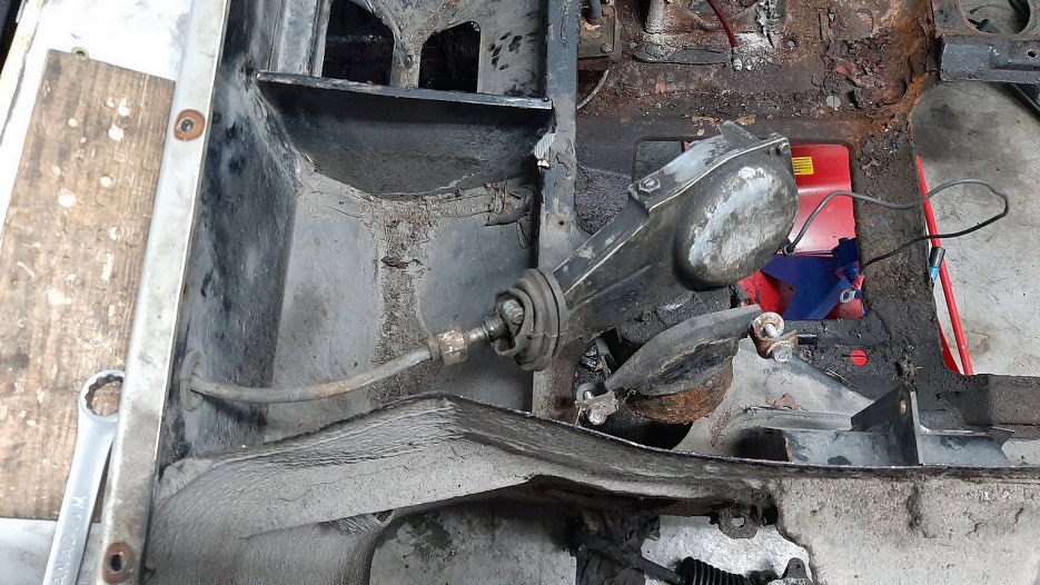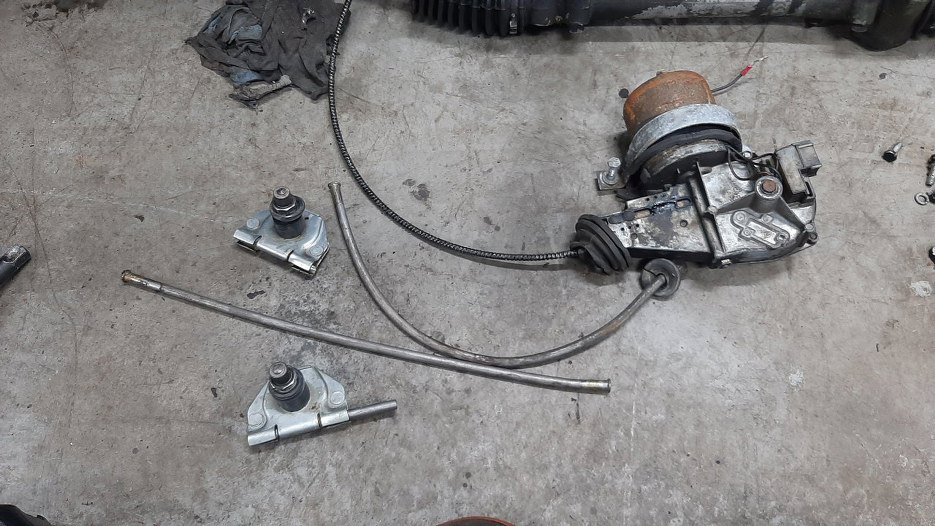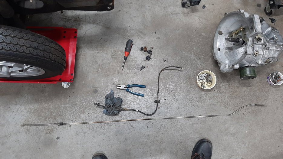 Wyciągnąłem z niej rurkę paliwa. Tuż przy grodzi jest krótki łącznik gumowy i dalej jest ta długa rurka aż do zbiornika paliwa. Na skrzynię biegów nie zwracaj uwagi, jest już gotowa, ale relacja z tego będzie ciut później.