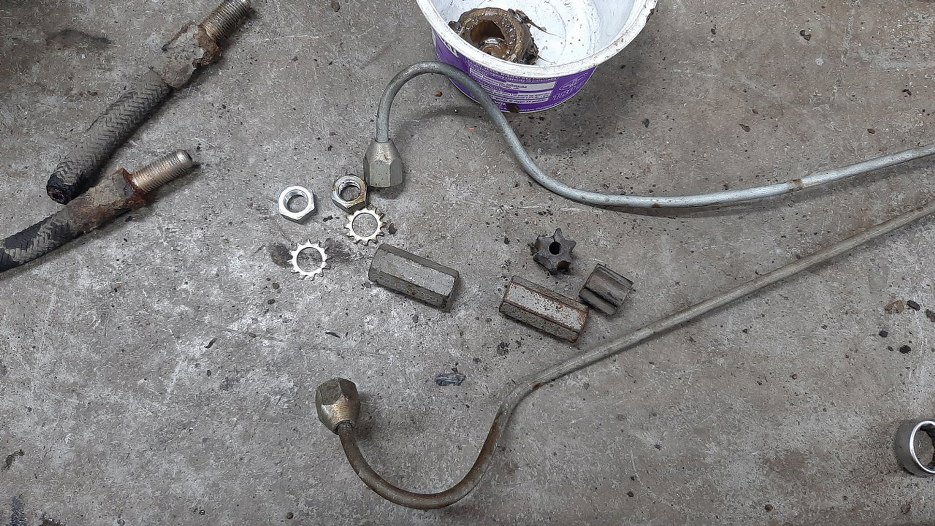 Trzeba teraz wszystko przygotować do odnowienia. Rozkręcam rurki hamulcowe w drobny mak.