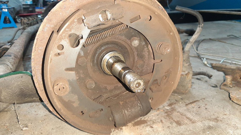 Szczęki trochę zużyte, w środku sucho, bez wycieków. Odkręcę teraz te cztery śruby widoczne obok czopu piasty - to one trzymają tarczę kotwiczną do belki zawieszenia.