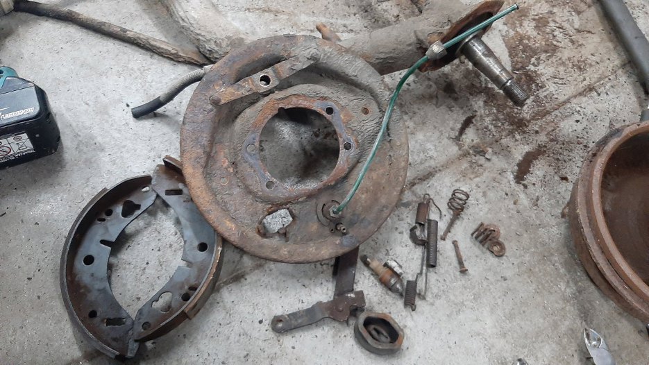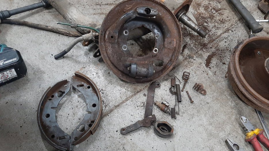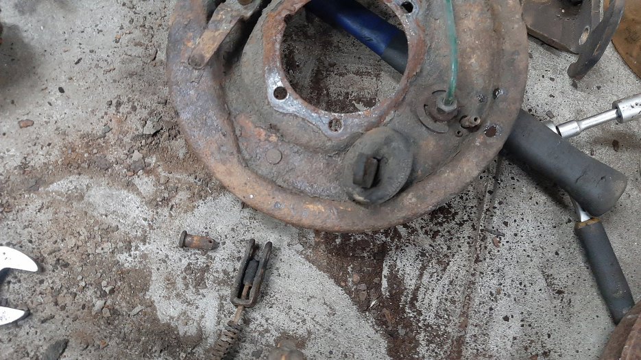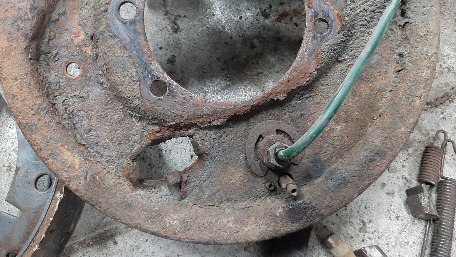 Zdemontowałem teraz wszystkie części składowe hamulca, łącznie ze śrubą regulacyjną. Został tylko cylinderek hamulcowy.