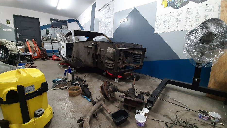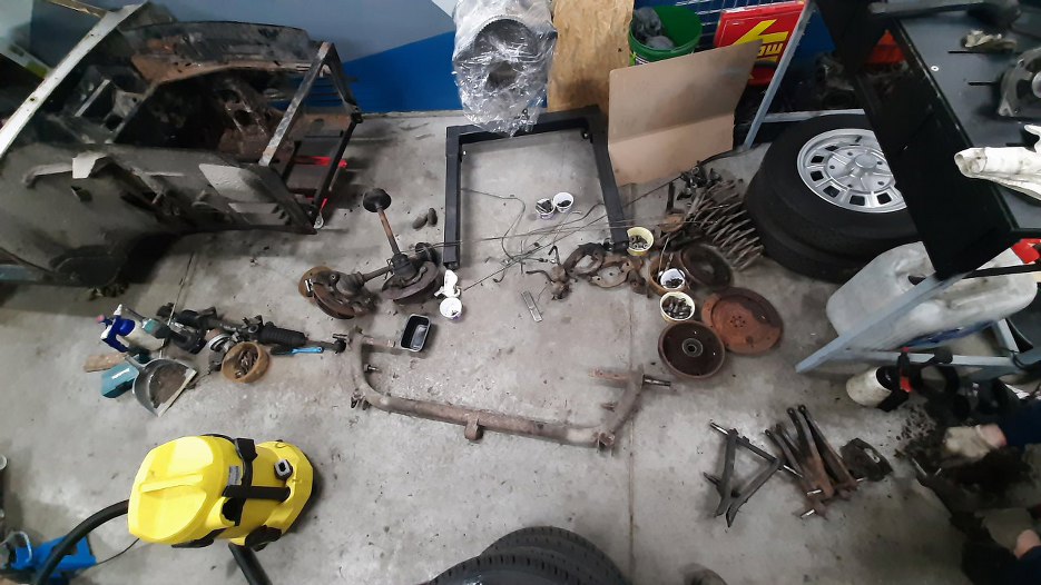 Z bębnów wyjąłem na prasie łożyska, stary smar musiał zostać pożegnany. A tu mamy efekt końcowy zabezpieczania części - wszystko leży i czeka na wywiezienie do piaskarni. Widać też pojemniki ze śrubkami już przygotowanymi do ocynku.