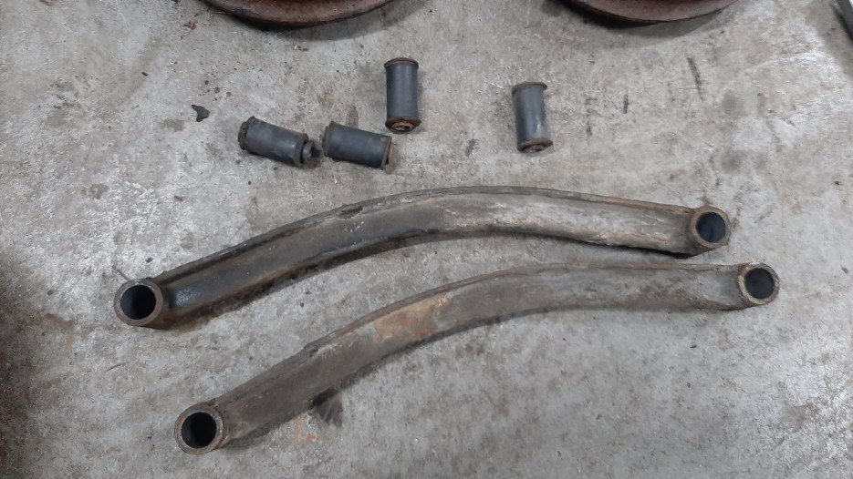 Wycisnąłem też na prasie tulejki z wahaczy tylnych. Tu nie trzeba nic zabezpieczać, bo lakier w środku otworów nic nie zaszkodzi - tuleje nie mają stali na zewnątrz, tylko gumę, więc da się nowe łatwo wcisnąć nawet w lakierowane otwory.