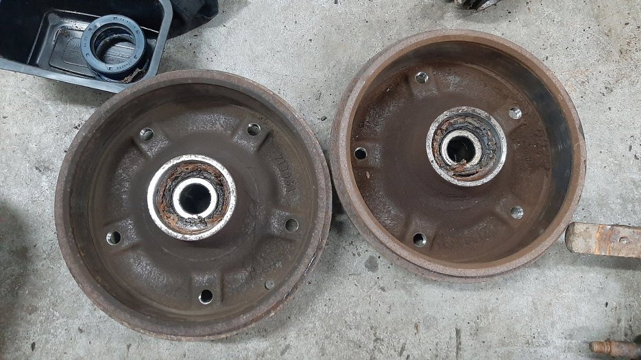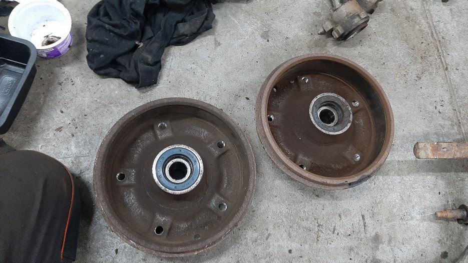 Jeden bęben zszedł bez problemu, drugi stawiał zaciekły opór - łożyska jakoś się na czopie przykleiły. Same bębny w środku bardzo ładne, nie zużyte.