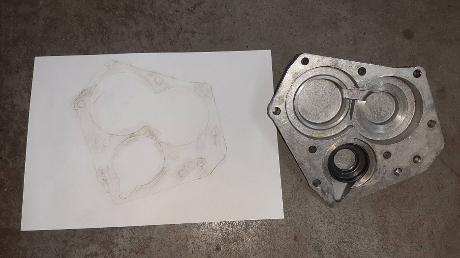 Po umyciu tylnej pokrywki skrzyni muszę dorobić nową uszczelkę. Najpierw odrysowałem kontur pokrywki brudnym palcem po papierze (najlepszy sposób!).