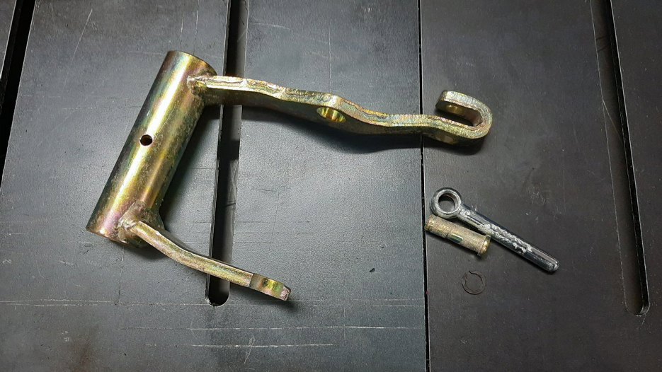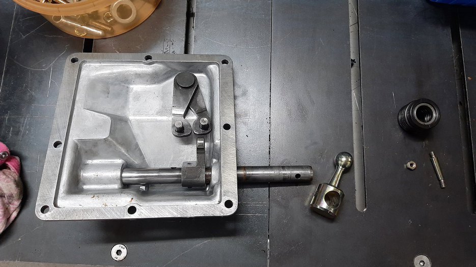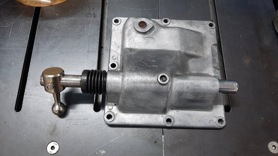 Po zalaniu skrzyni olejem wkręciłem korek. Założyłem też dźwigienkę załączania mechanizmu wolnego koła (to ta plastikowa część) razem z wajchą idącą do środka kabiny. Przykręciłem też pokrywkę widoczną u góry. Musiałem ją najpierw trochę podprostować, bo jest z cienkiego aluminium i była mocno pogięta.