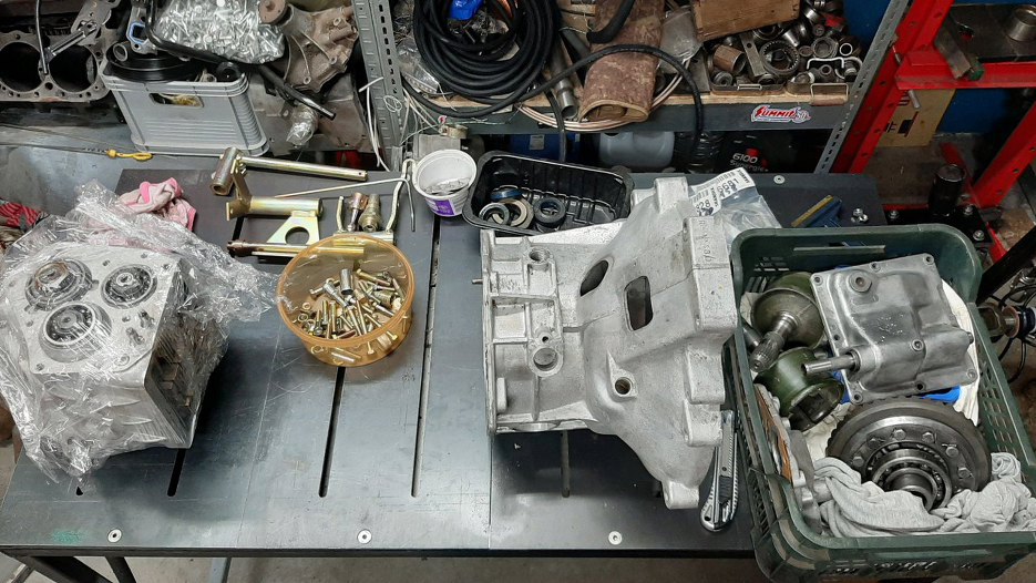 Przygotowałem teraz wszystkie części skrzyni do składania. Widać, że skrzynia była umyta i zapakowana, żeby się nic do niej ne dostało. Nieco na prawo od skrzyni są ocynowane detale, potem obudowa sprzęgła i skrzynka z częściami.