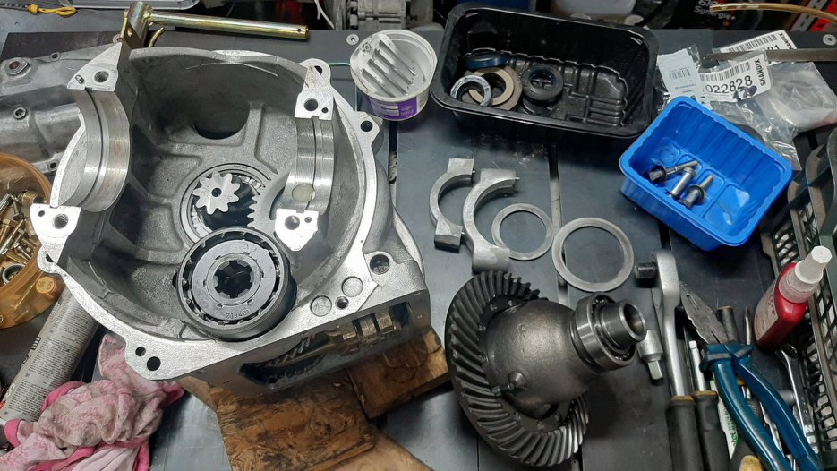 Odwróciłem skrzynię i postawiłem ją na drewnianych klockach, żeby się nie kiwała. Sprawdziłem łożyska mechanizmu różnicowego - wyglądają na dobre. Najprostszy sposób na sprawdzenie większości łożysk to ich dokładne umycie, żeby nie miały w sobie żadnego smaru ani oleju i rozkręcenie ich sprężonym powietrzem do dużej prędkości obrotowej. Zazwyczaj jakiekolwiek zużycie łożyska od razu słychać w dźwięku wydawanym przez łożysko.