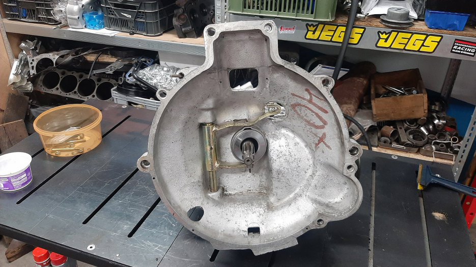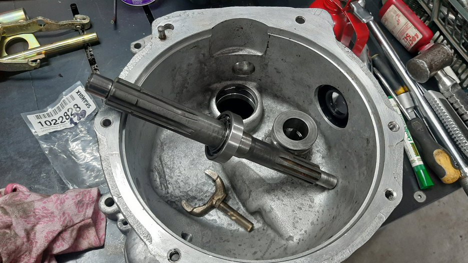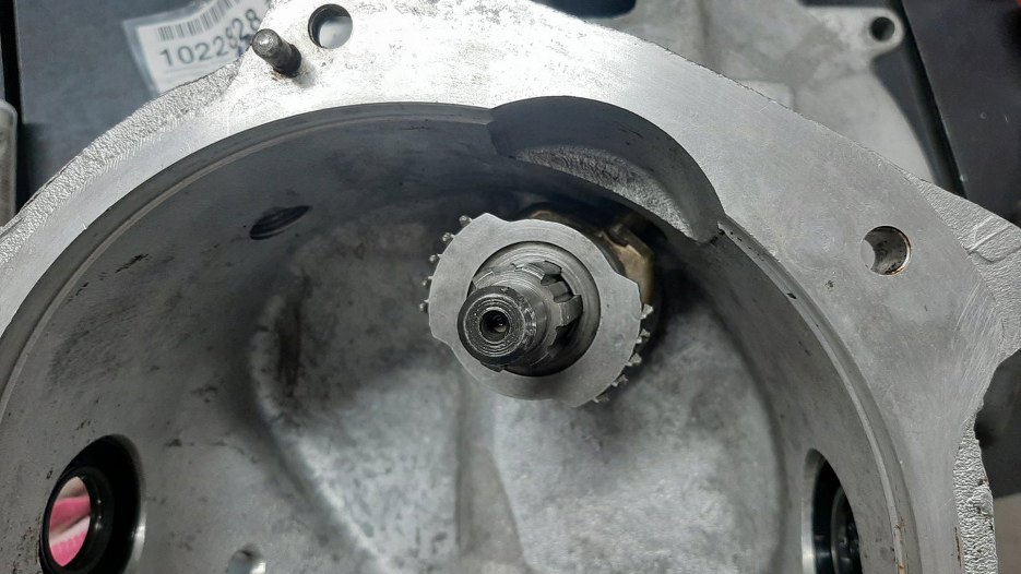 Włożyłem wałek sprzęgłowy i część mechanizmu wolnego koła. Widać podcięcie na ten mechanizm w obudowie skrzyni.