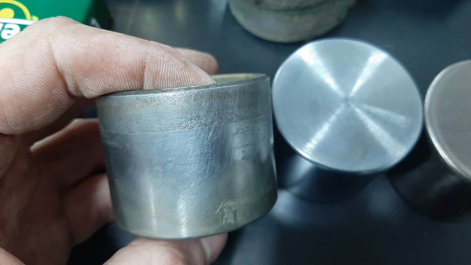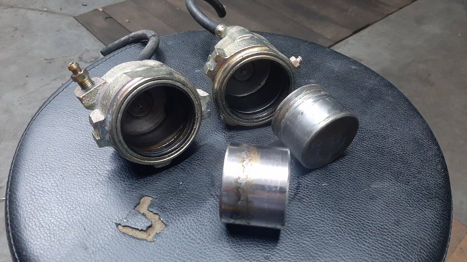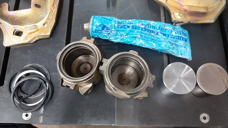 Siłowniki zacisków zabezpieczone były dość prosto - odpowietrznik na miejscu, obcięta rurka hamulcowa, tłoczek włożony na miejce. Tuż po odbiorze z galwanizerni wyjąłem tłoczki i dokładnie umyłem wnętrze cylindra, żeby pozbyć się resztek chemii pozostałej po cynkowaniu. Jeden tłoczek ma dość sporo wżerów - jest do wyrzucenia.