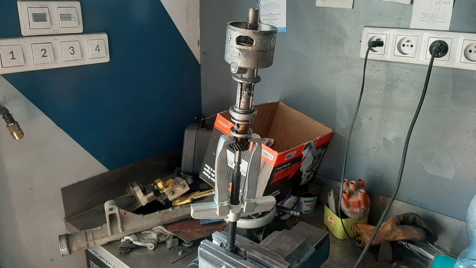 Potem ściągnąłem zębatkę napędzającą aparat. Ściągacz wykorzystany w dość niekonwencjonalny sposób :).