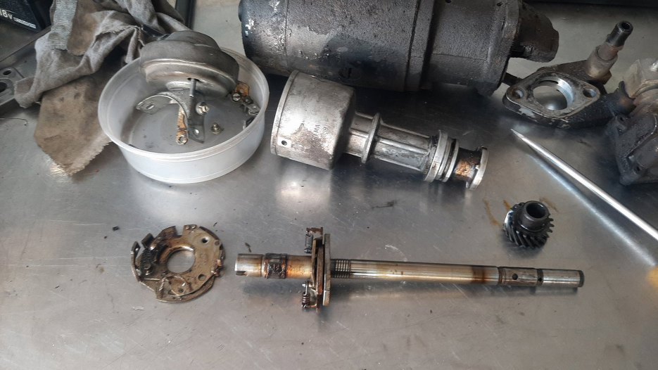 Po zdjęciu zębatki można wyjąć oś aparatu z obudowy. W obudowie łożysko (tulejka) nie ma luzów, więc nie ma potrzeby go wymieniać. Muszę oczyścić płytkę od podciśnieniowego mechanizmu opóźnienia zapłonu i tą, co została na ośce aparatu, od odśrodkowego przyśpieszenia zapłonu.