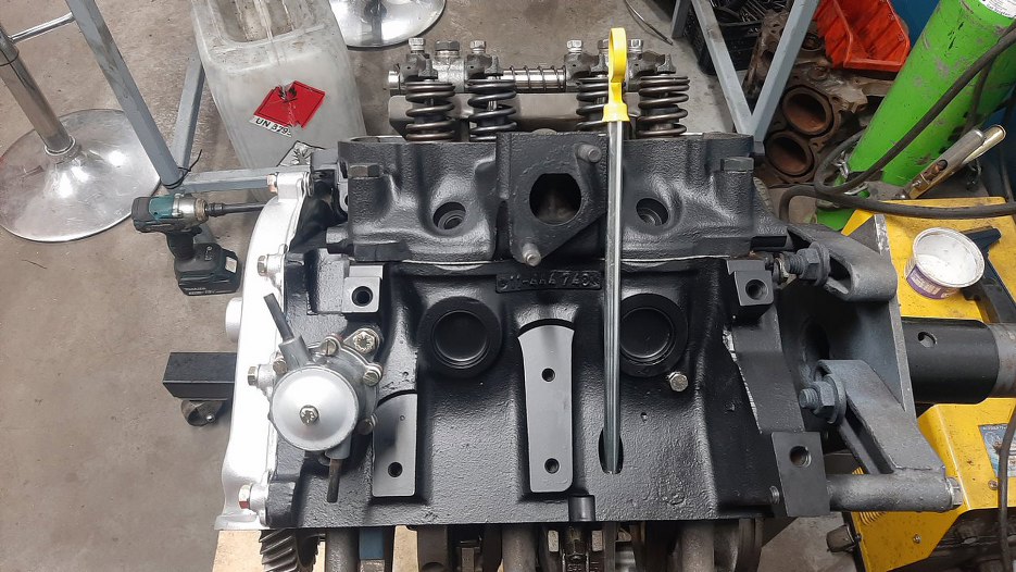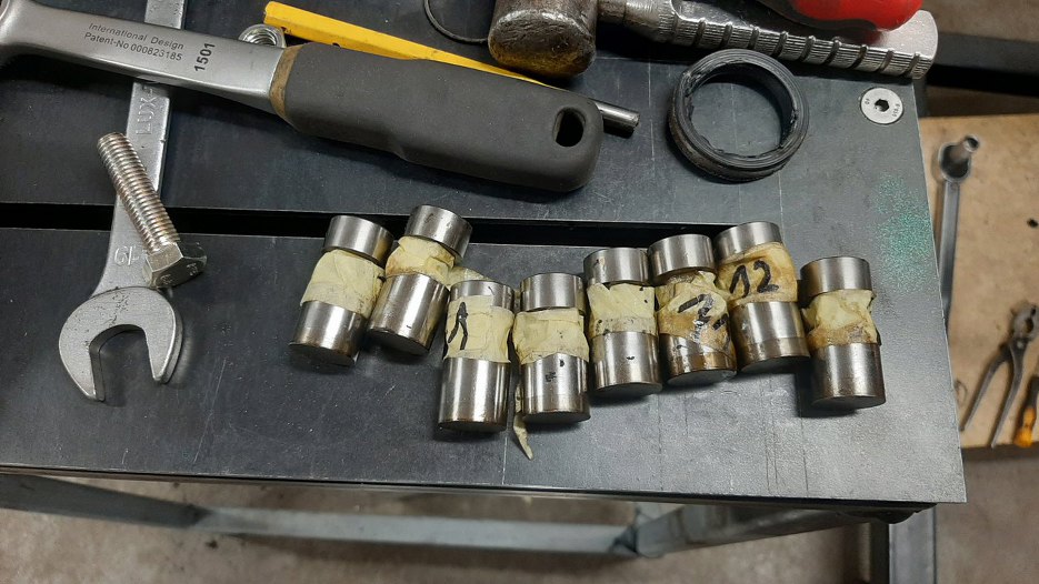 W tym momencie się okazało, że przygotowywana przeze mnie pokrywa rozrządu nie jest gotowa... o niej opowiem więc trochę później. Póki co na zdjęciach będzie się przewijała inna, zapasowa, niepomalowana. Musiałem coś przykręcić, żeby dobrze ułożyć uszczelniacz pomiędzy blachą rozrządu a blokiem. Tymczasem składam silnik dalej - muszę umyć popychacze i włożyć je tam, skąd były wyjęte.