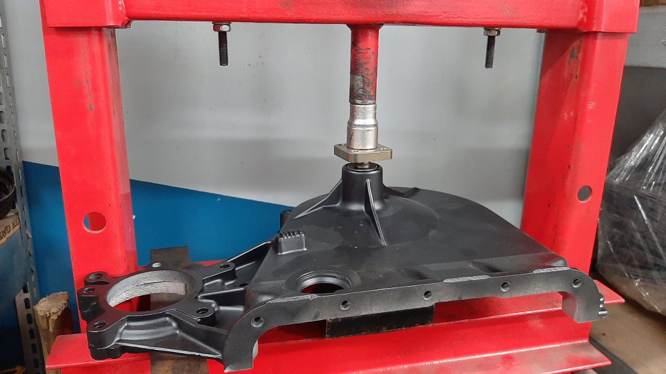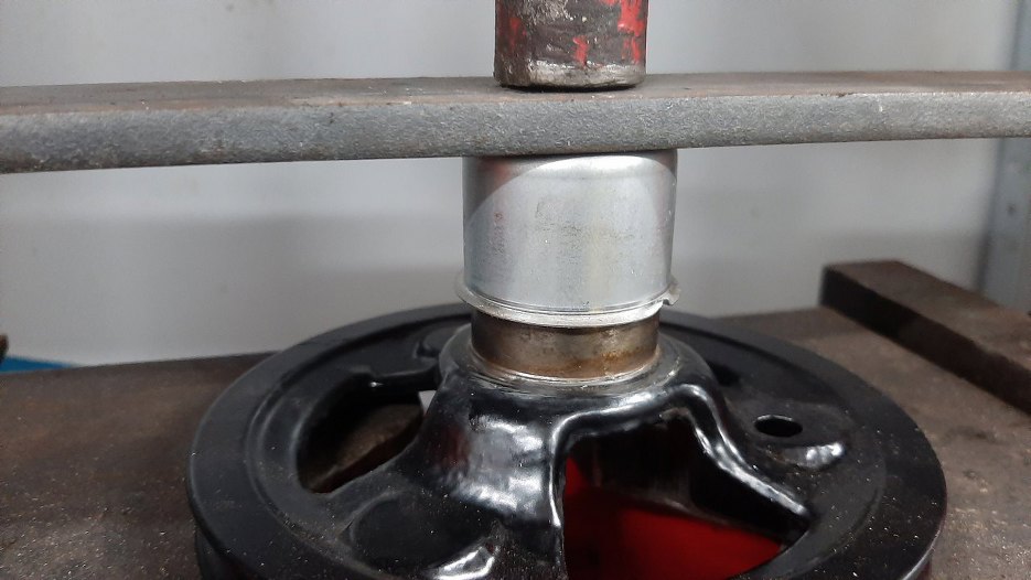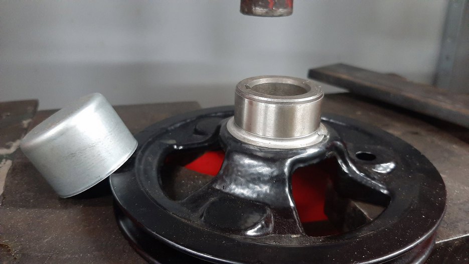 Koło pasowe miało wżery i prawdopodobnie by nieco podciekało. Dlatego wciskam na prasie tulejkę naprawczą (Speedy-Sleeve).