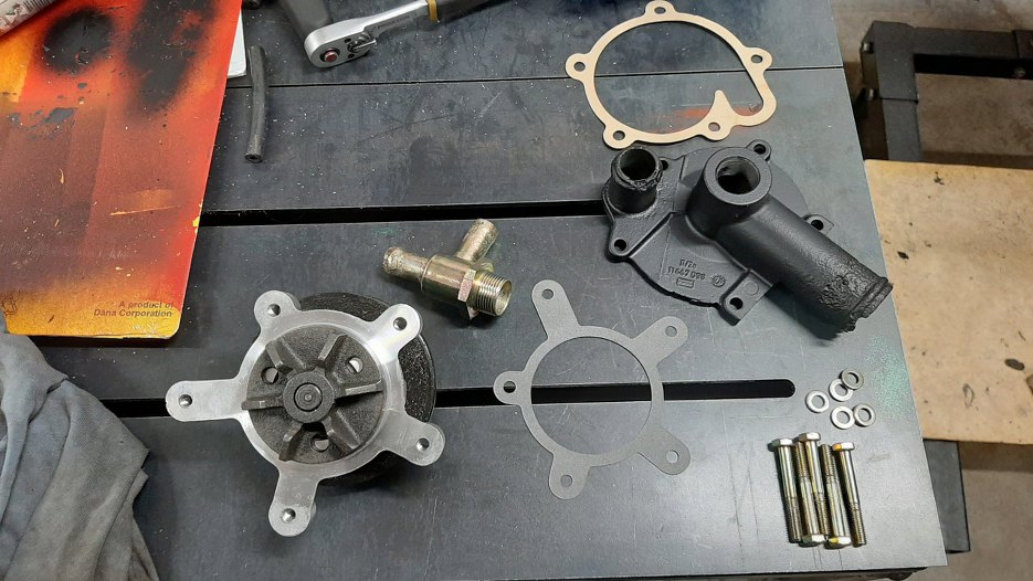 Teraz przykręcę nową pompę wody. Obok widać pokrywkę tylną i resztę potrzebnych rzeczy.