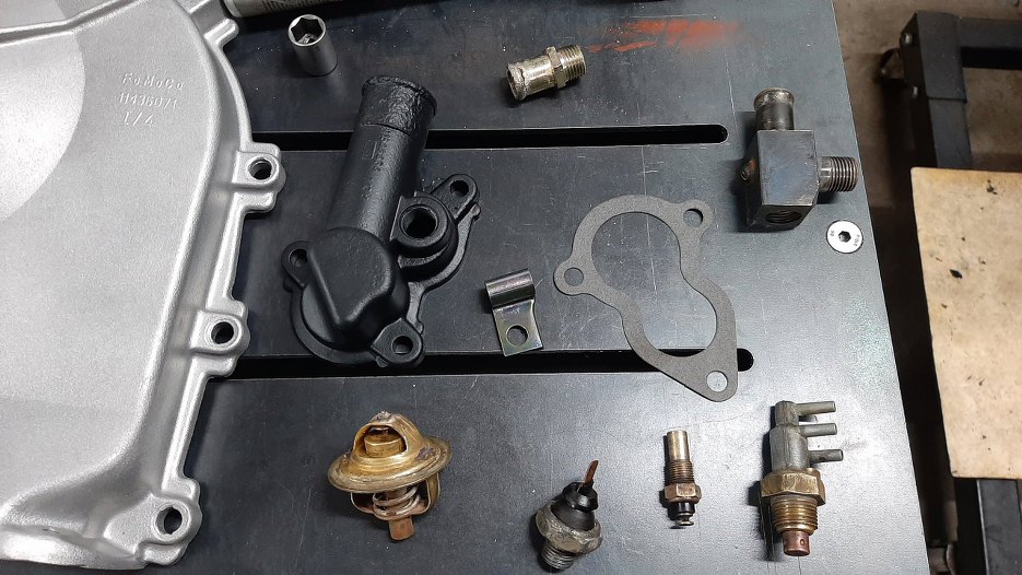 Przygotowałem też termostat z obudową i wszystko co dookoła. Czujnik ciśnienia oleju też przykręcę.